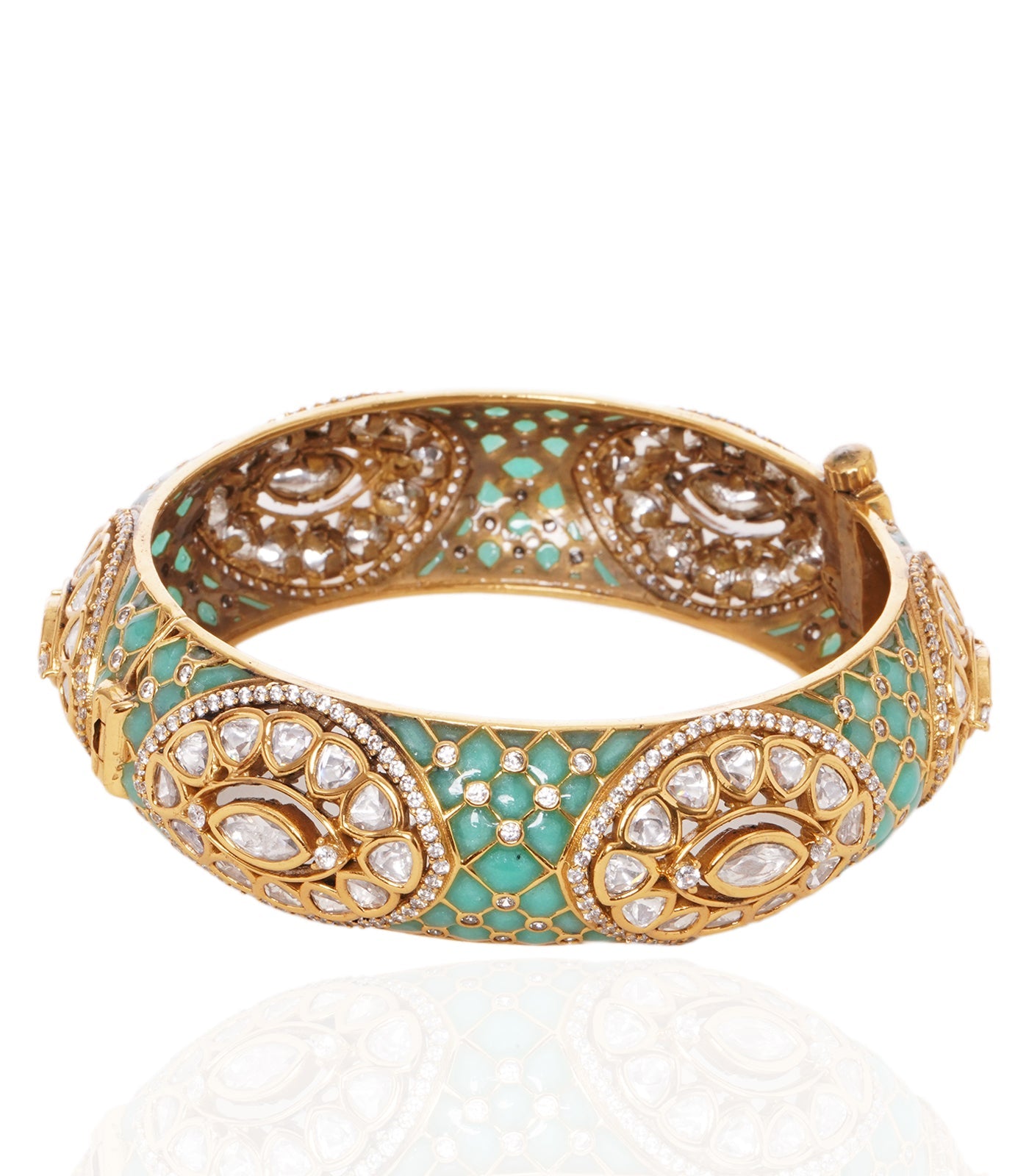 A stunning mint-colored polki bangle exuding royal elegance, adorned with intricate detailing and sparkling uncut stones, perfect as a bold statement accessory.