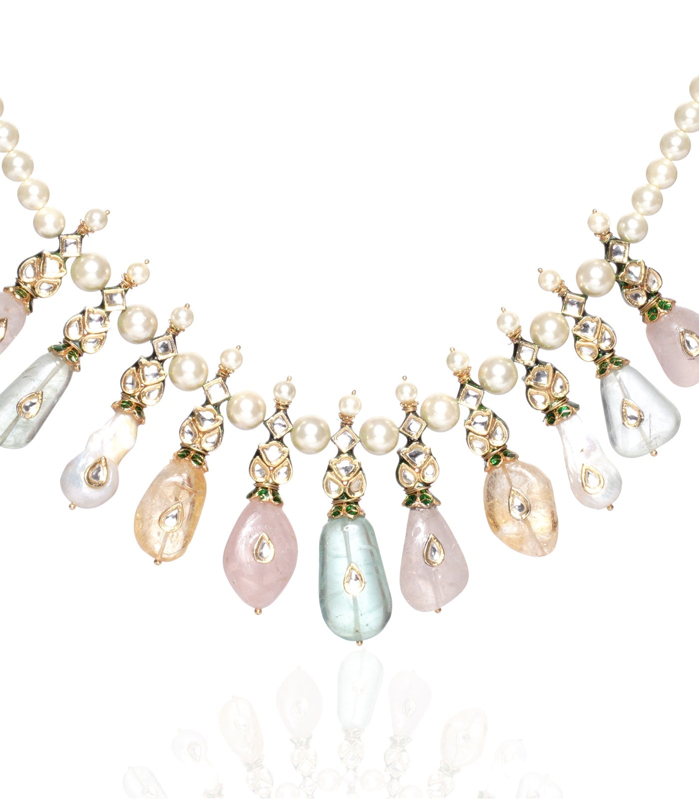 Dance your steps into modern elegance with our Kundan Navratan Necklace. The gold finish and multi-colored Navratan drops infuse a vibrant and contemporary charm, creating a pastel-inspired look that's perfect for any occasion.