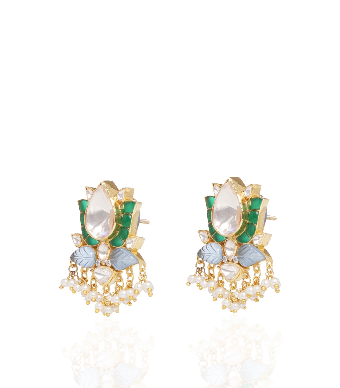Experience divine polish with our Lotus-inspired earrings. Adorned with a large moissanite centerpiece, emeralds, and graceful grey fluorite drops, these earrings exude perpetual beauty and sophistication.
