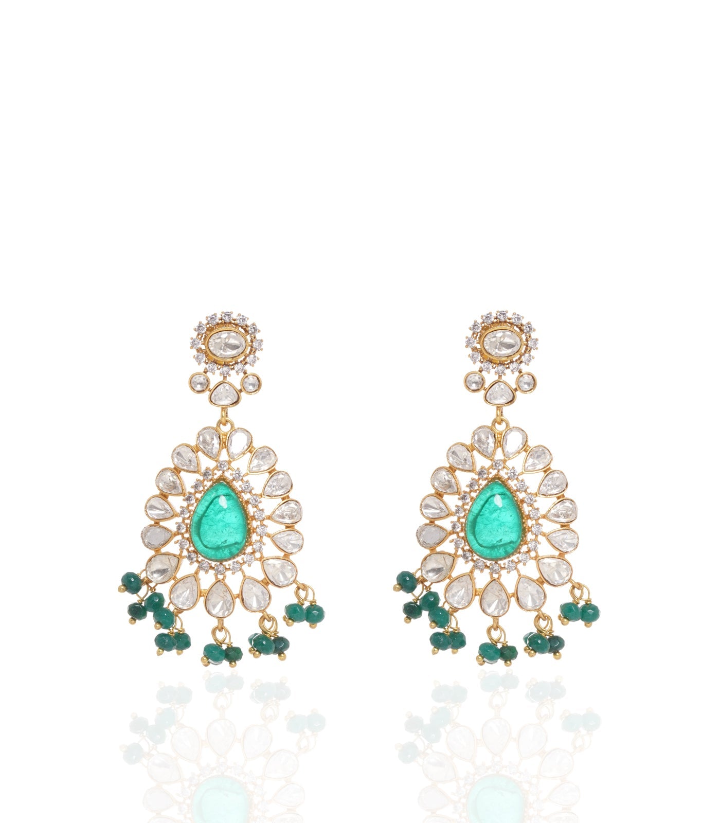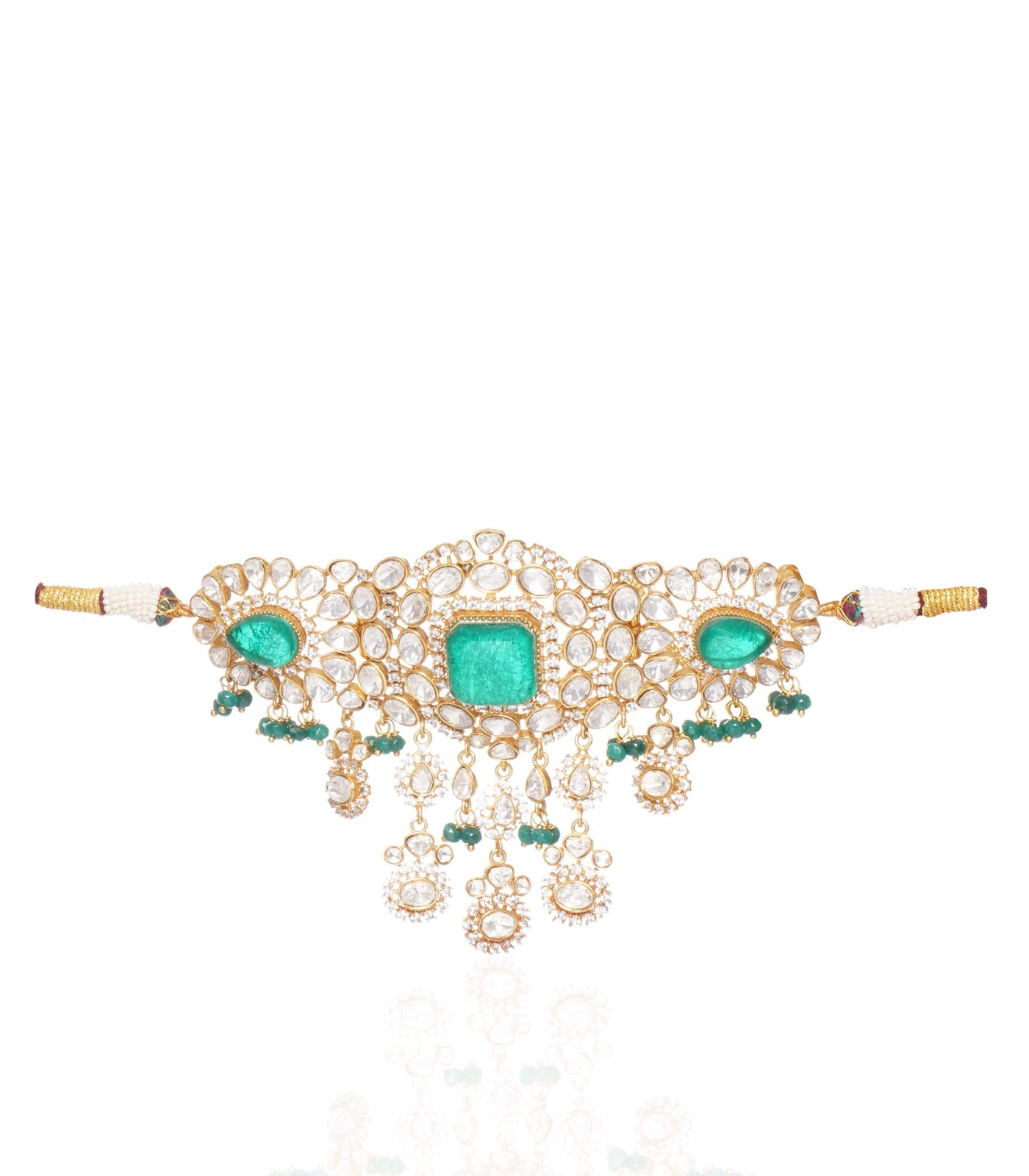 Uprise your glamour with our Vintage-inspired Necklace Set. Adorned with Zircon, Kundan stones, and Flourite Emerald, plated in antique gold finish on alloy base, this set exudes timeless allure. The addition of Green Onyx drops brings a touch of regal sophistication to your ensemble.