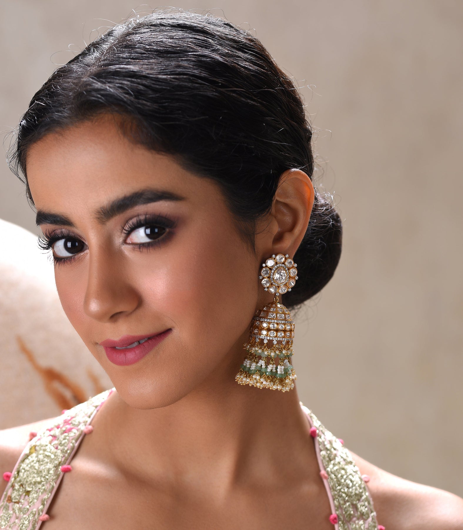 Upturn your ethnic charm with our Moissanite Jhumkas. The domes adorned with shimmering moissanite, gracefully complemented by monochromatic green drops, creating a perfect union of glamour and tradition.
