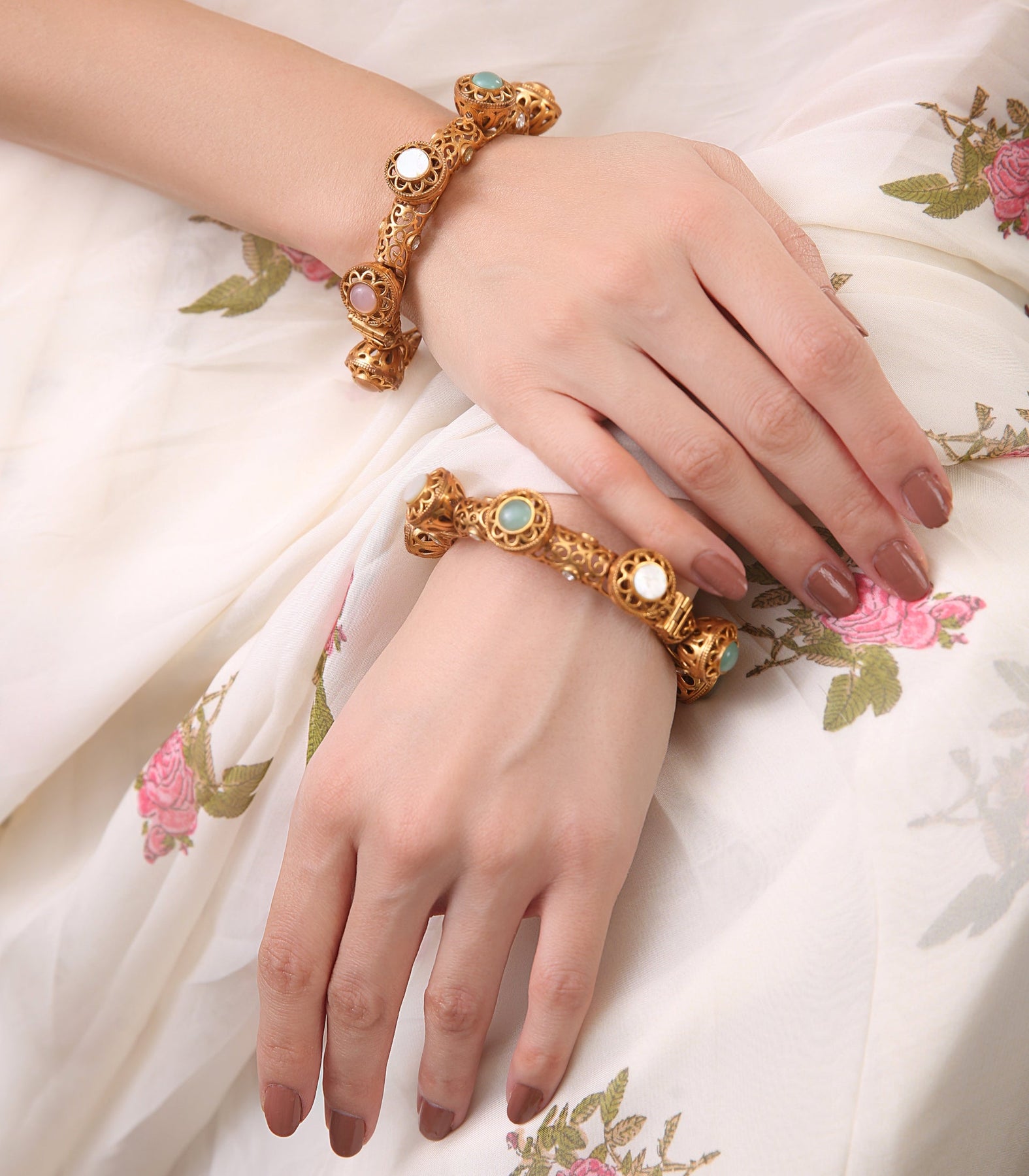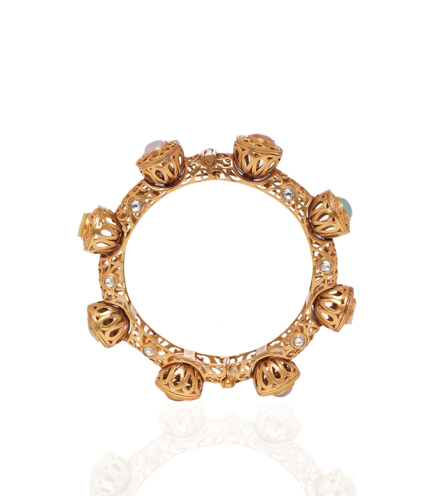 Embrace royal splendor with our Gold-Finished Navratan and Kundan Bangle. Adorned with resplendent stones, this piece exudes regality, ensuring you feel like a queen every time you wear them.