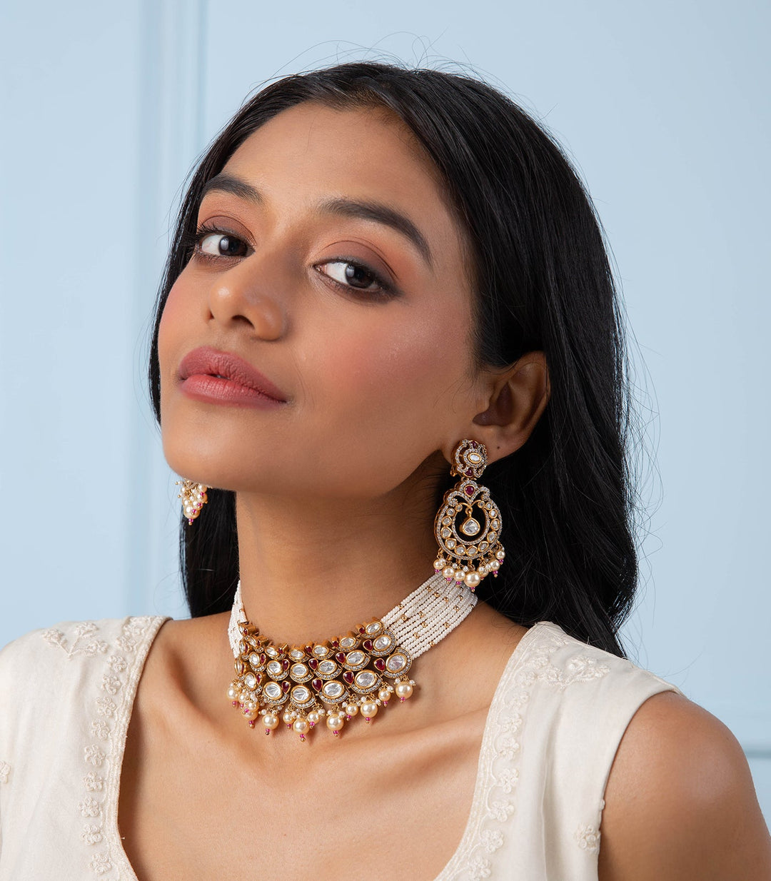 BHAVIYA ANTIQUE GOLD FINISH RED POLKI CHOKER SET