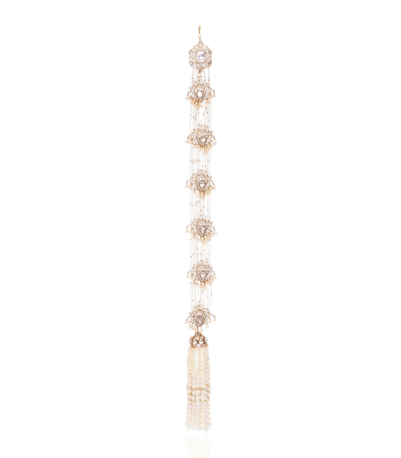 A contemporary yet royal Kundan choti featuring intricate brooches with clear Kundan stones in a chic design. Enhanced with delicate white pearl strings and medium-sized pearl drops, it radiates timeless elegance and grandeur.