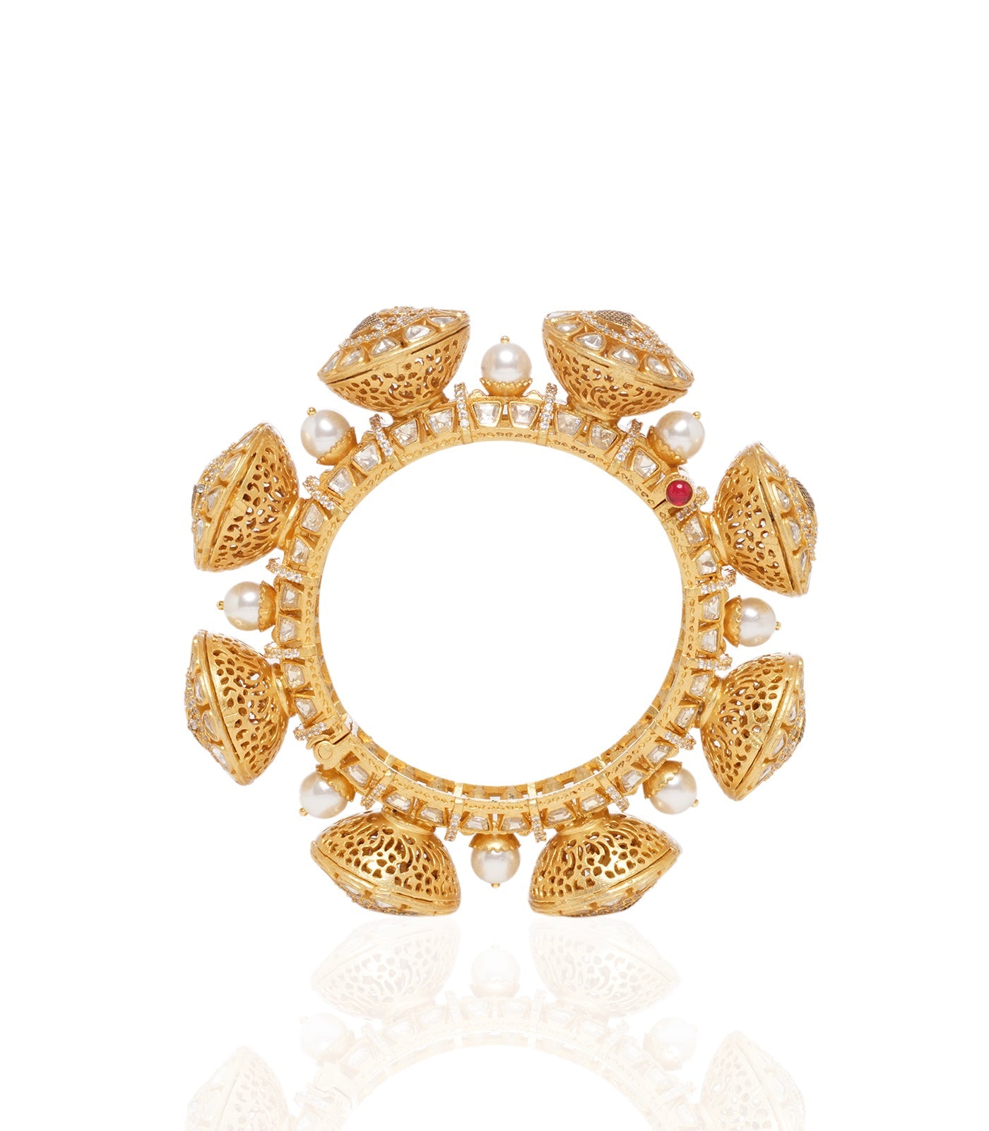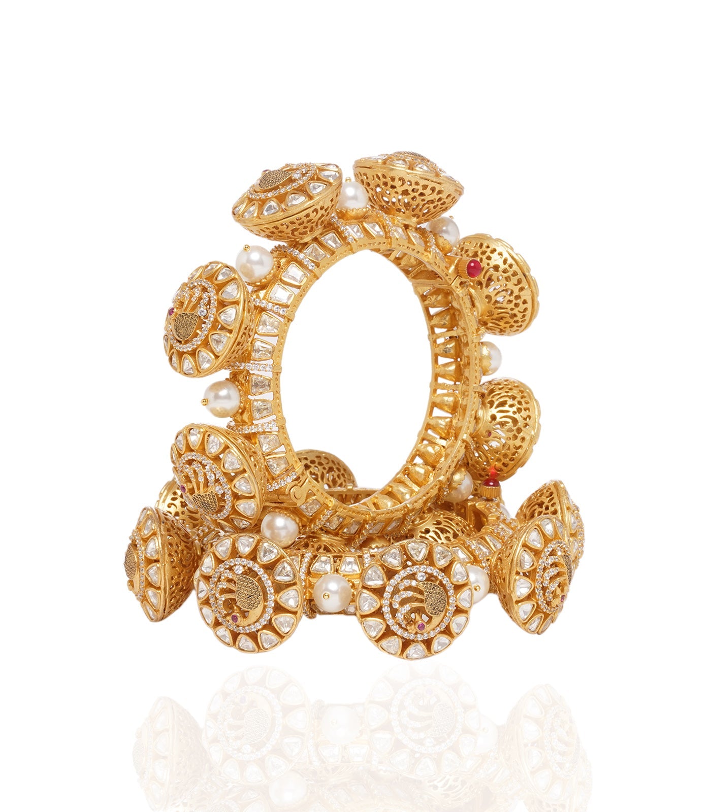Adorn your wrists with our enchanting peacock-inspired bangles. Clear moissanite stones shimmer in gold-plated elegance, gracefully adorned with pearls. A radiant fusion of nature's beauty and timeless sophistication.