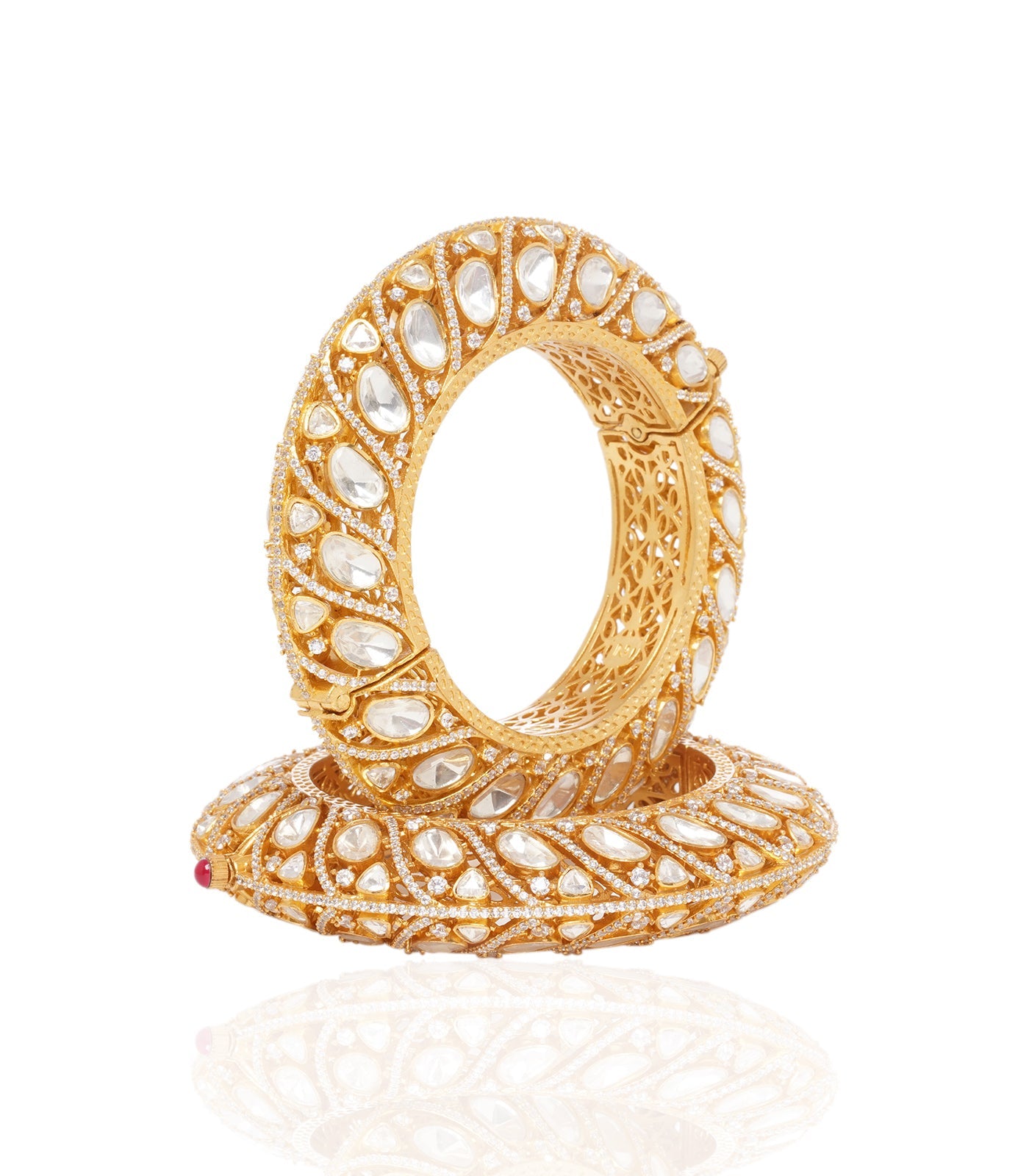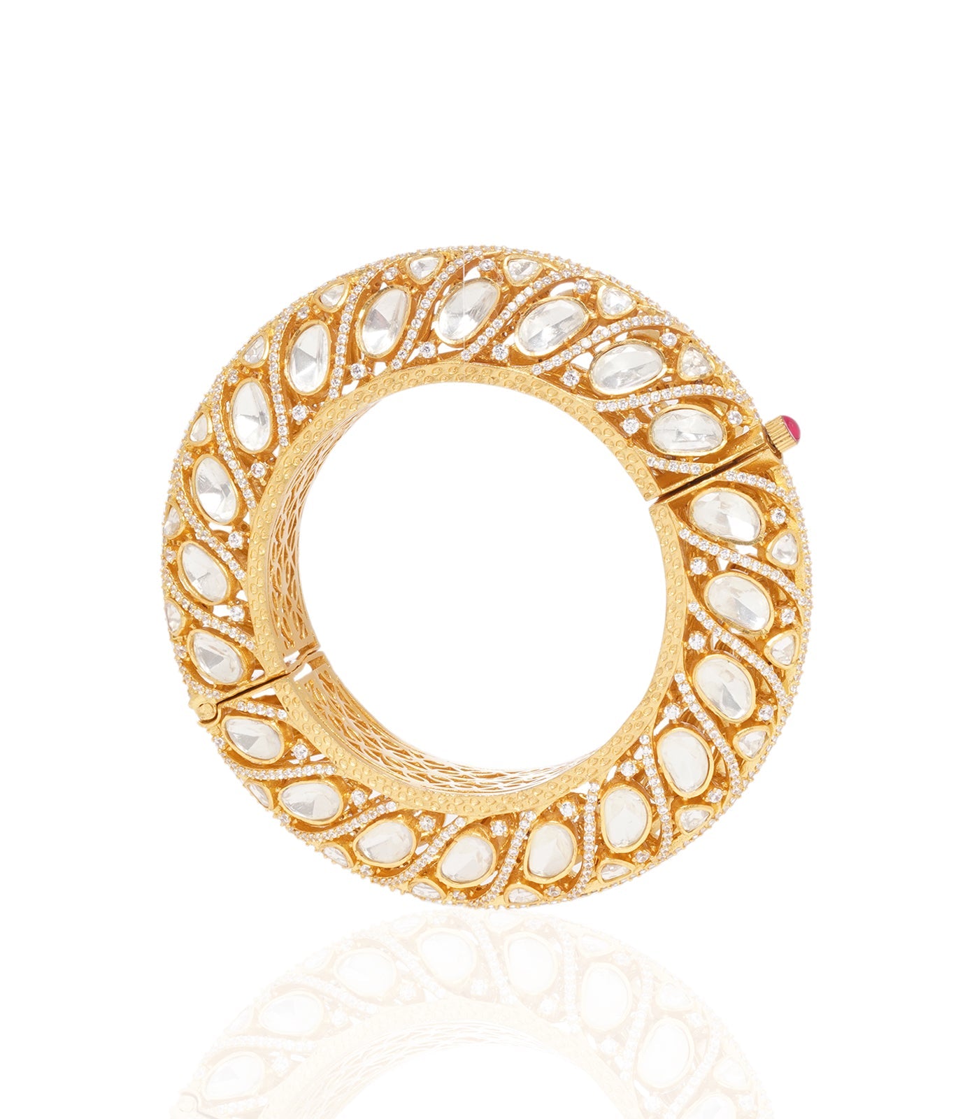 Step into glamour with our maximal bangles. Clear moissanite stones dazzle in gold-plated brilliance, creating a radiant accessory that shines with irresistible allure.
