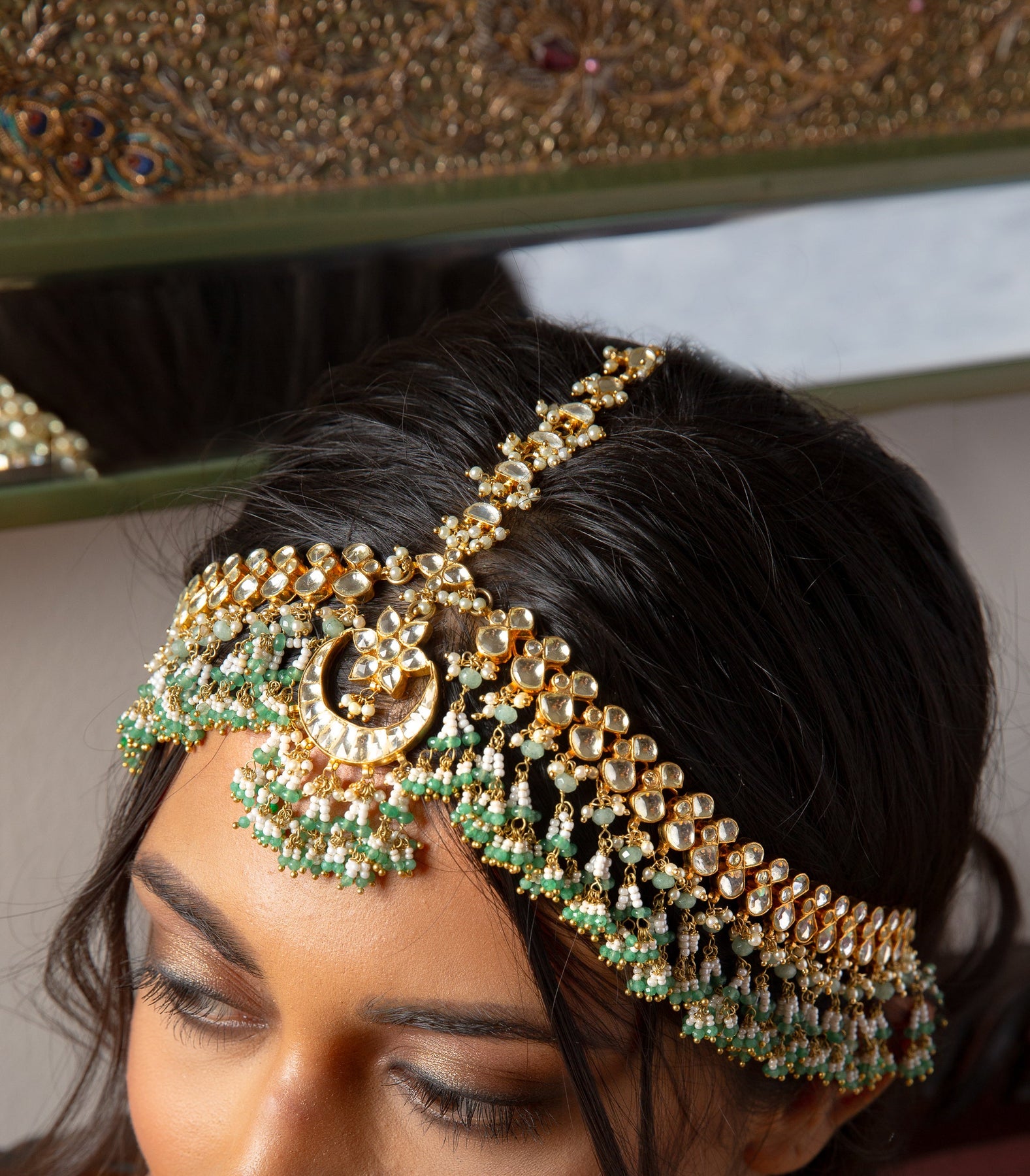 Bejewel your forehead with our Kundan Mathapatti. With a traditional design, gold finish, and green onyx drops, it adds a touch of elegance to your ensemble.