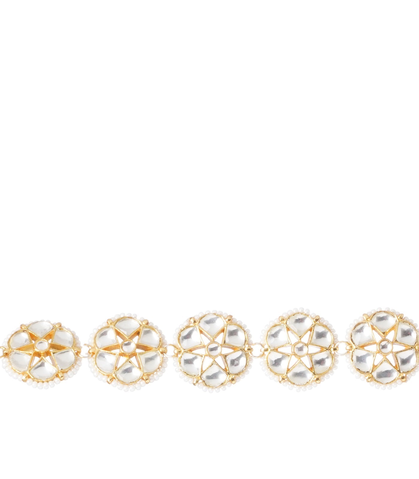 Illuminate your hairdo with our Gold-Plated Kundan Hairband, inspired by the brilliance of star flowers. Adorned with intricate Kundan pieces, this accessory adds a celestial touch to your style, combining elegance with a hint of celestial allure.