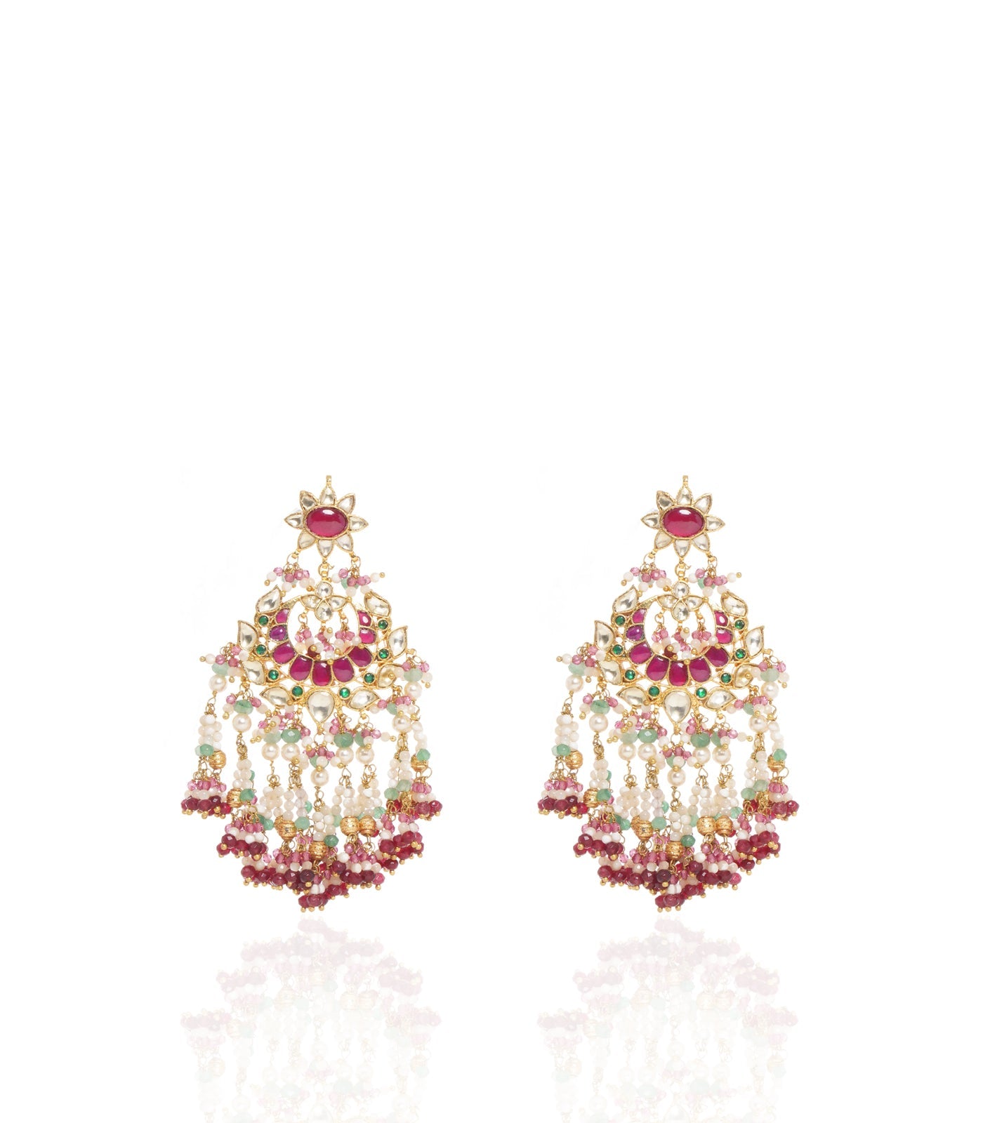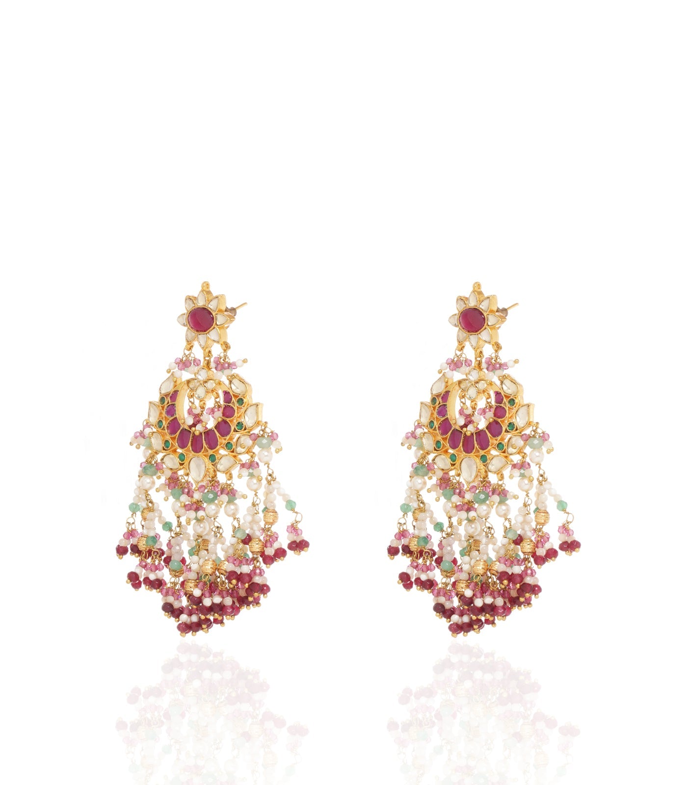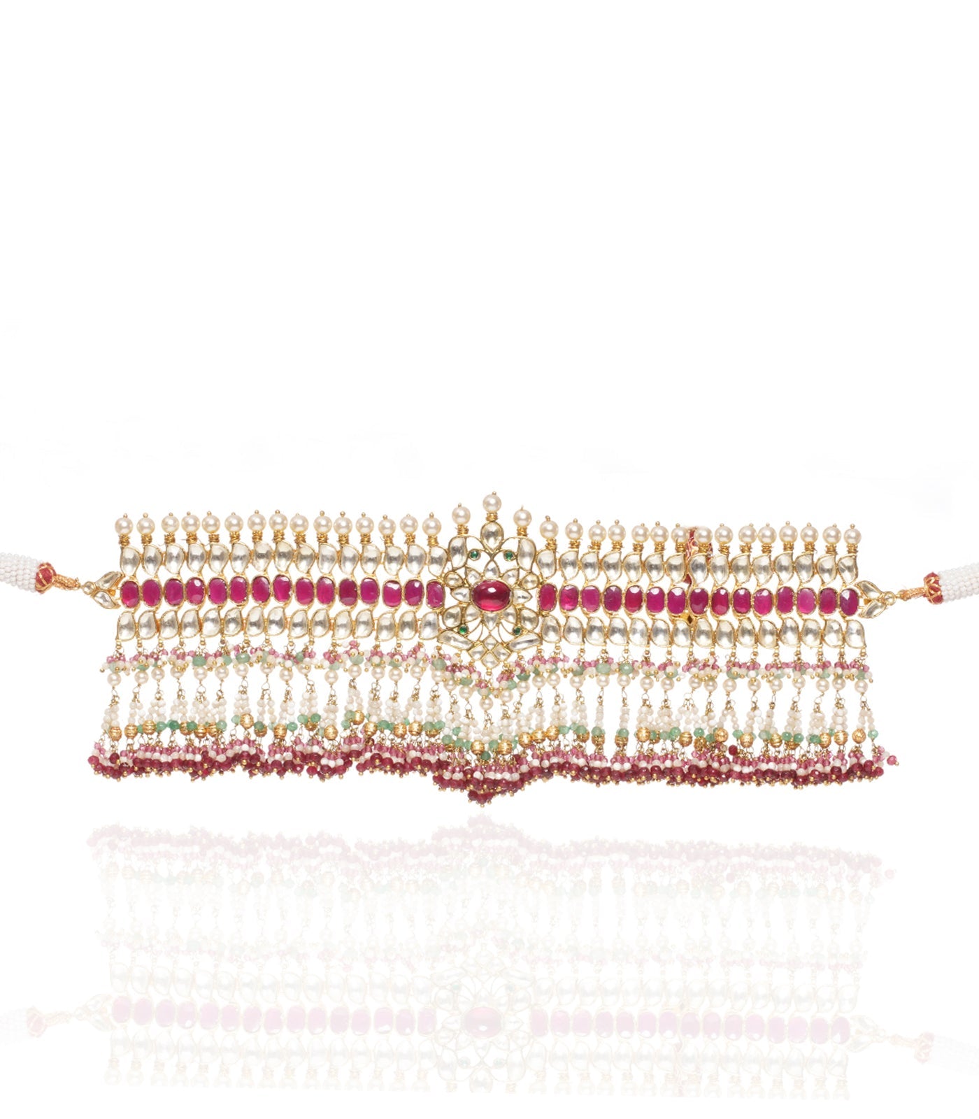 Uprise your style with our Kundan Stone Necklace Set, featuring a vibrant mix of green onyx, rich ruby, and lustrous pearl drops. The gold finish adds a touch of opulence, creating a necklace set that exudes a lively and multicolored vibe, perfect for making a statement.