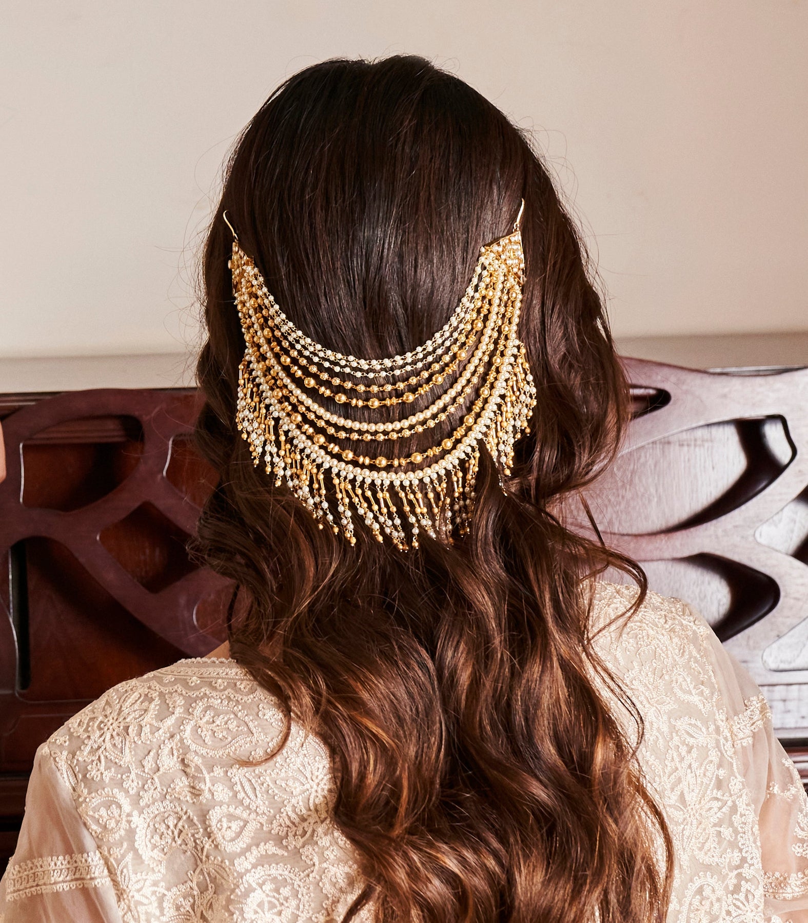 Clasp Mughal opulence with our Kundan Juda Pin. Gold-plated, adorned with golden balls and pearl strings, this pin emanates royal sophistication, adding regal charisma to your hairstyle.