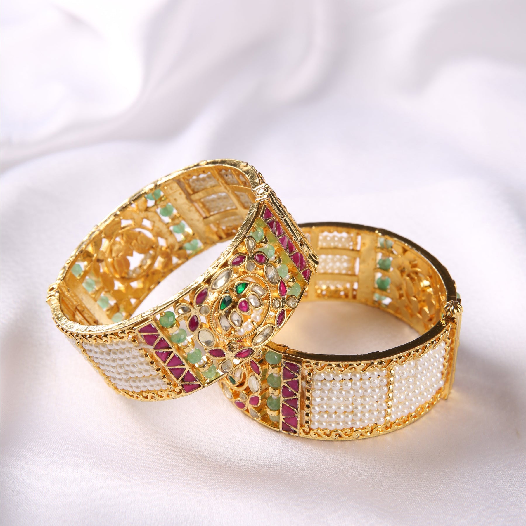 Embrace the allure of our Gold-Plated Kundan Bangles, inspired by the grace of lotus petals. Adorned with vibrant green and red Kundan pieces, and delicate pearl strings, these bangles exude elegance and unending beauty.