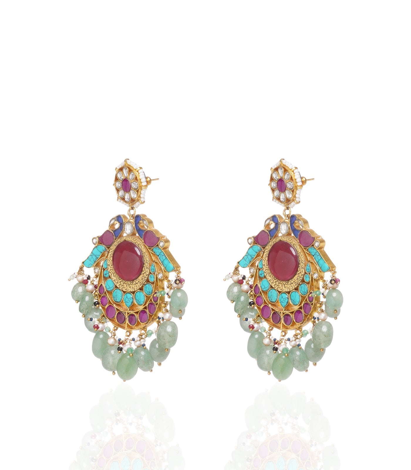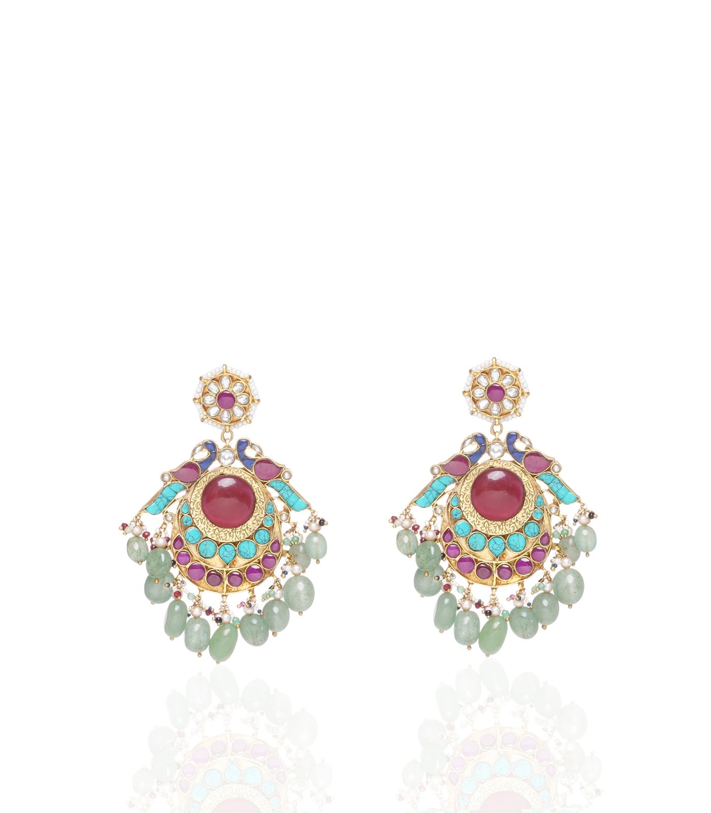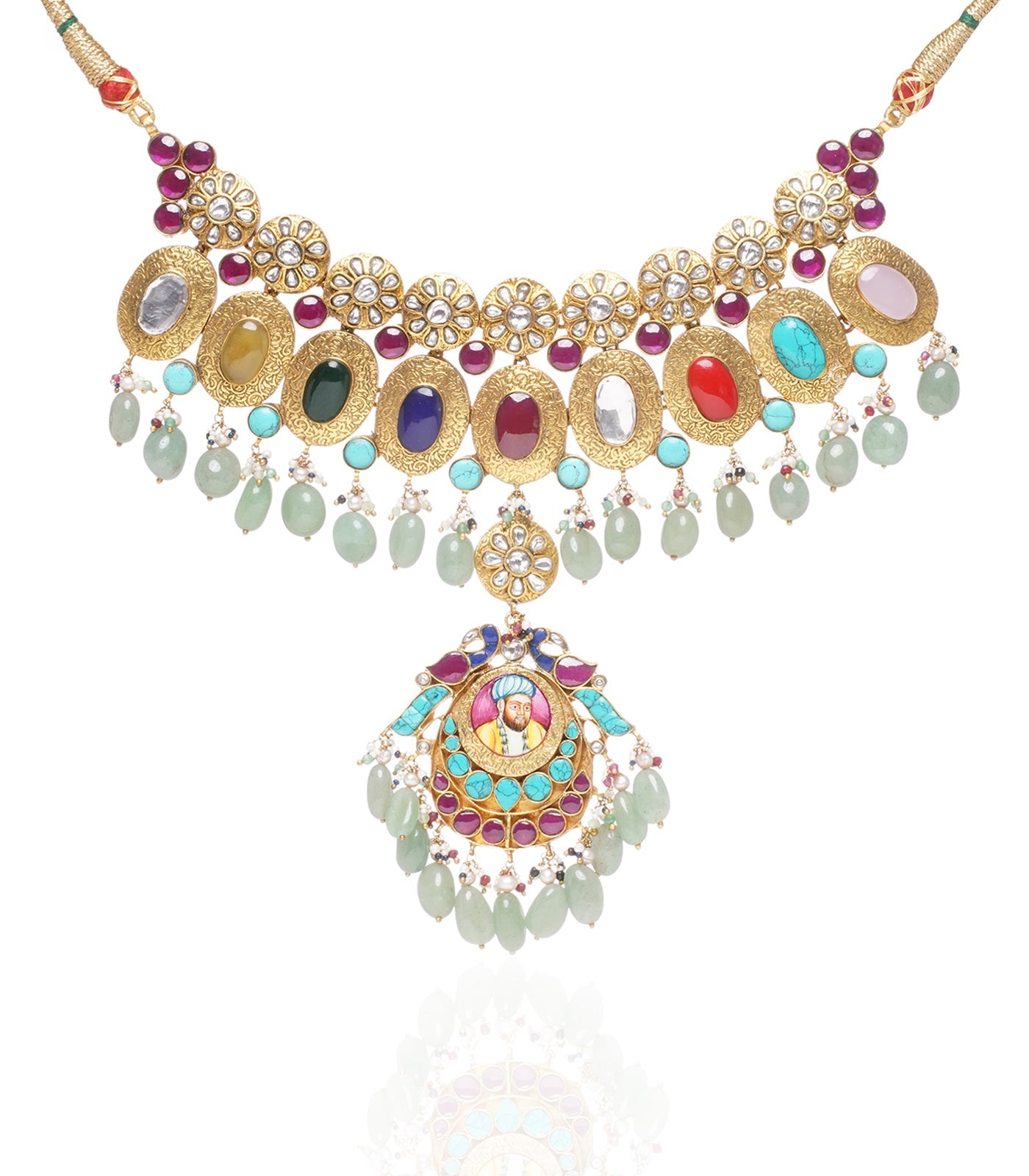 Heighten your style with our Kundan Necklace Set. Sterling silver, gold-plated, embellished with Navratan stones and adorned with green onyx beads, a perfect fusion of opulence and tradition.