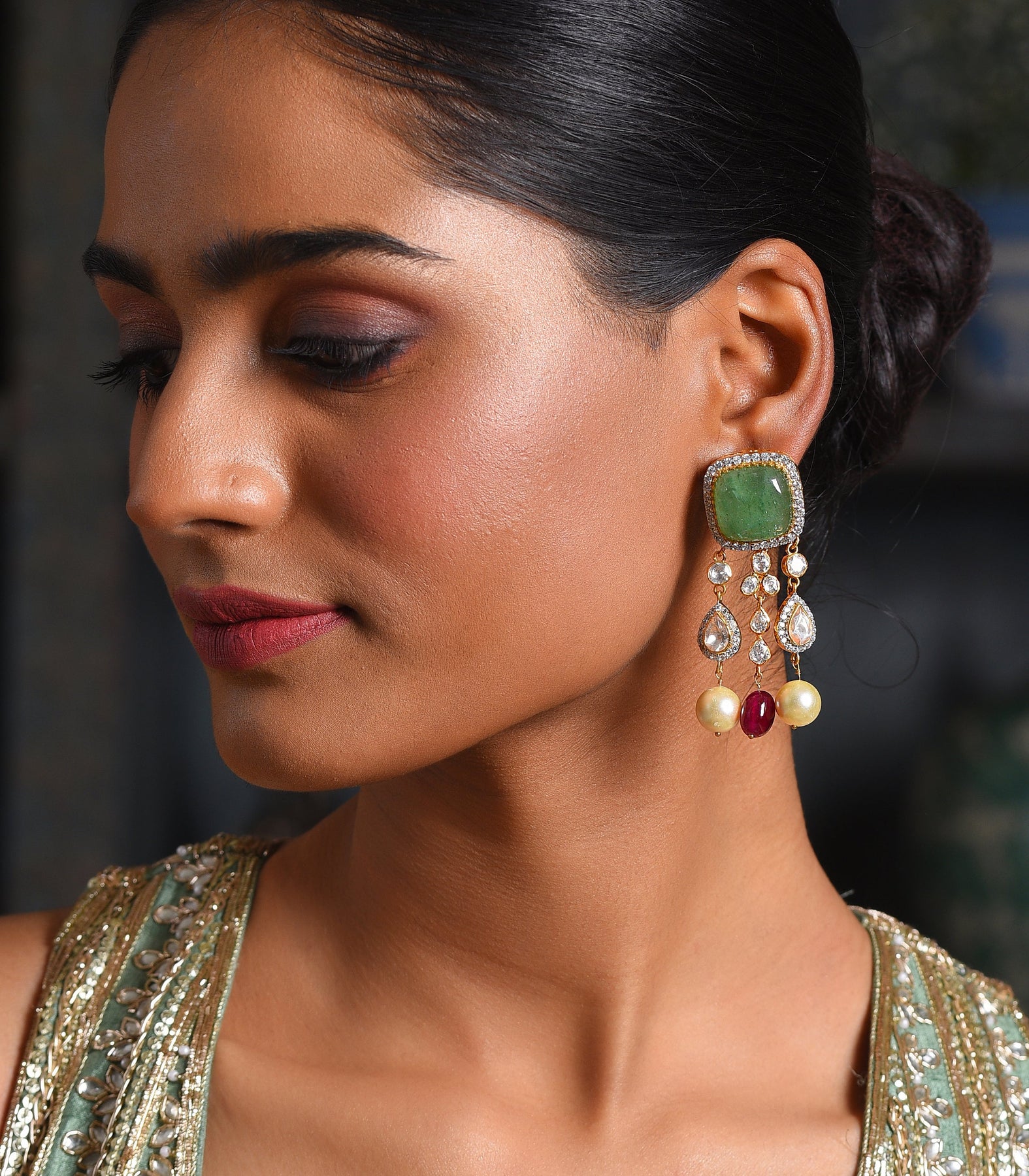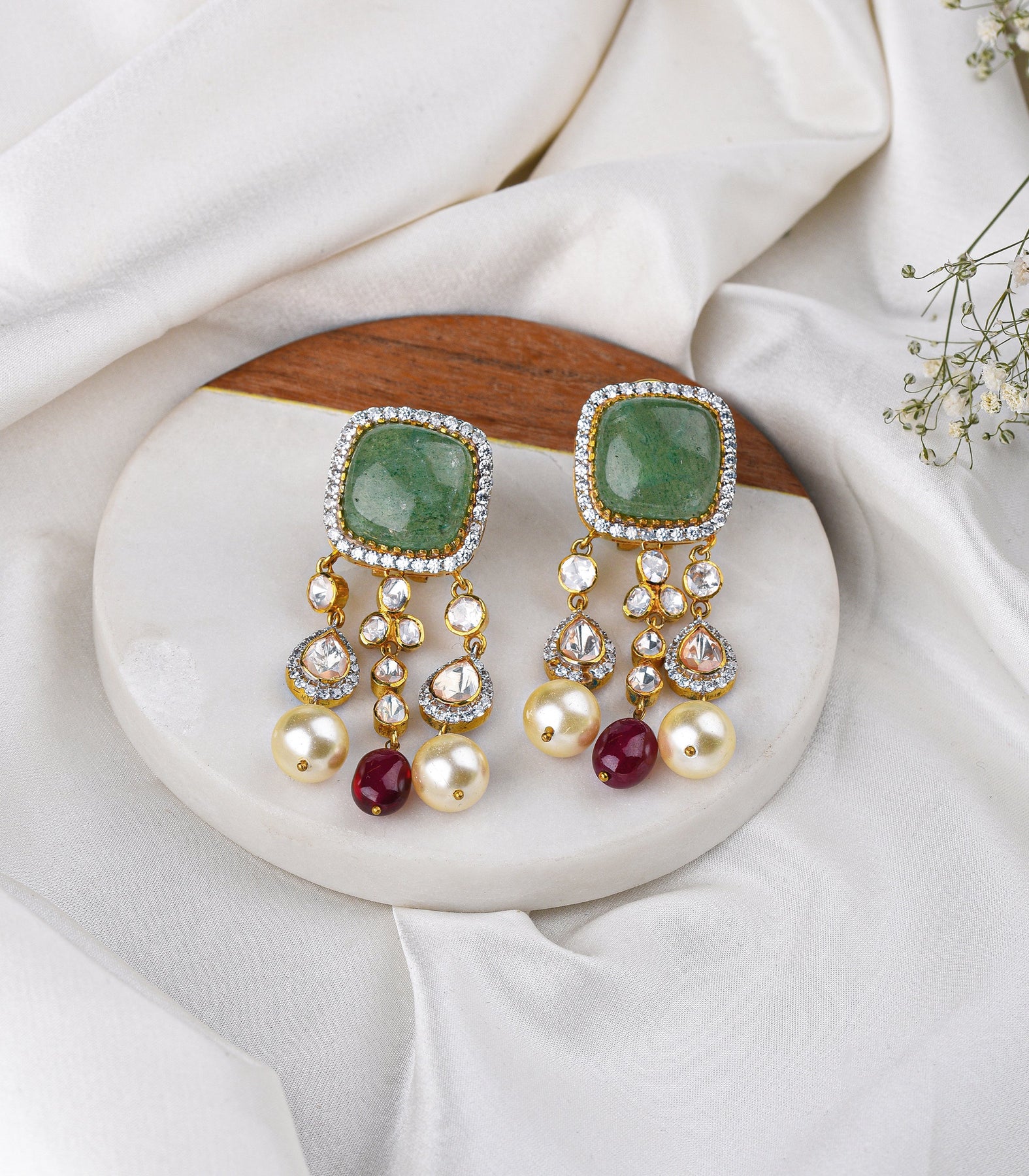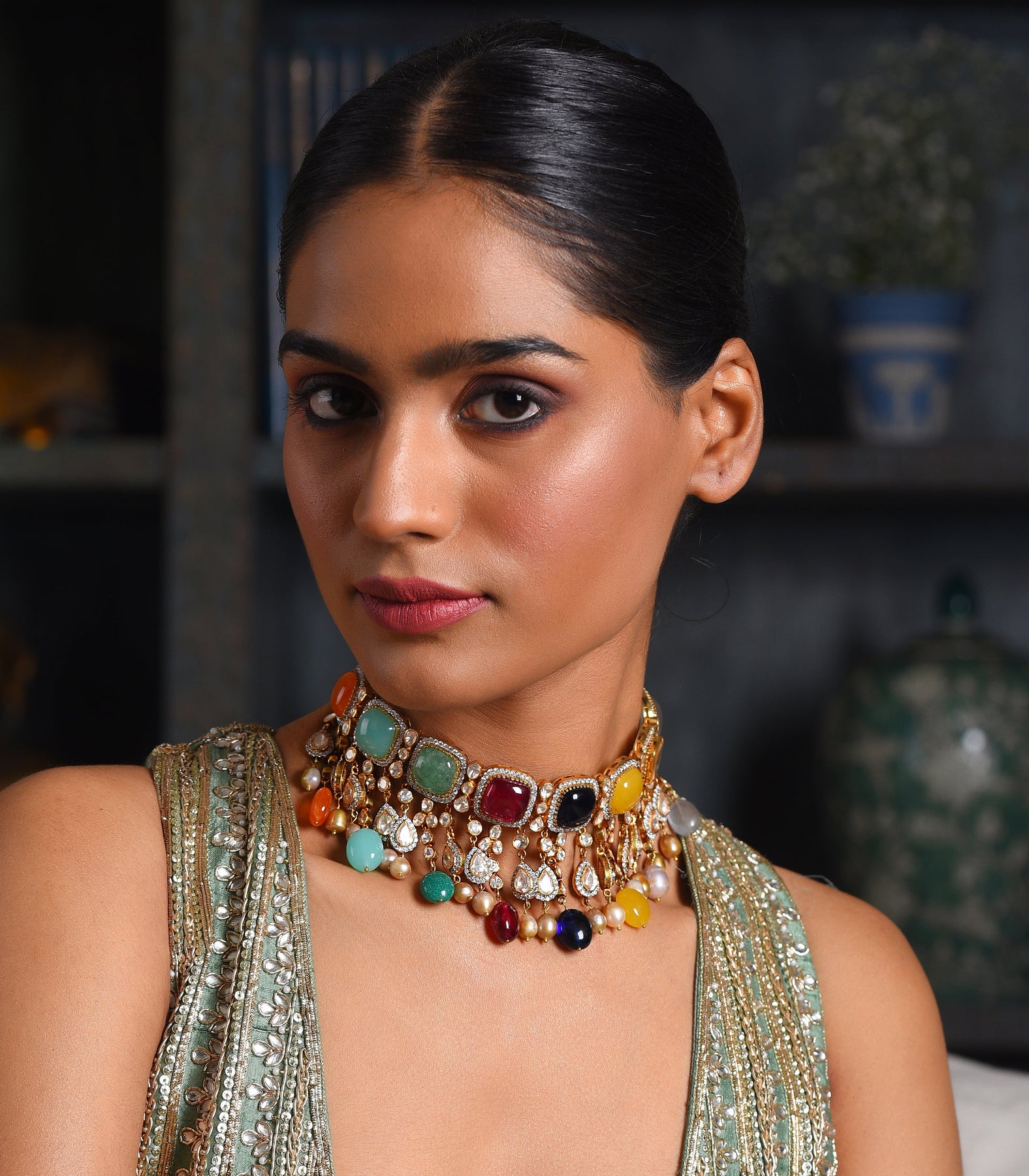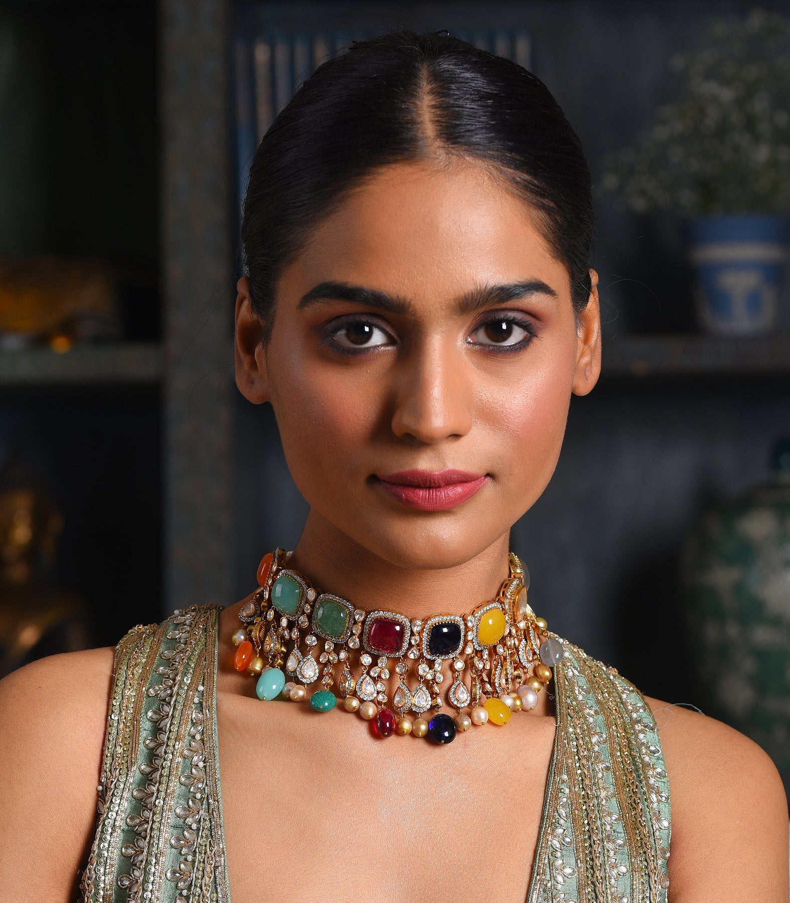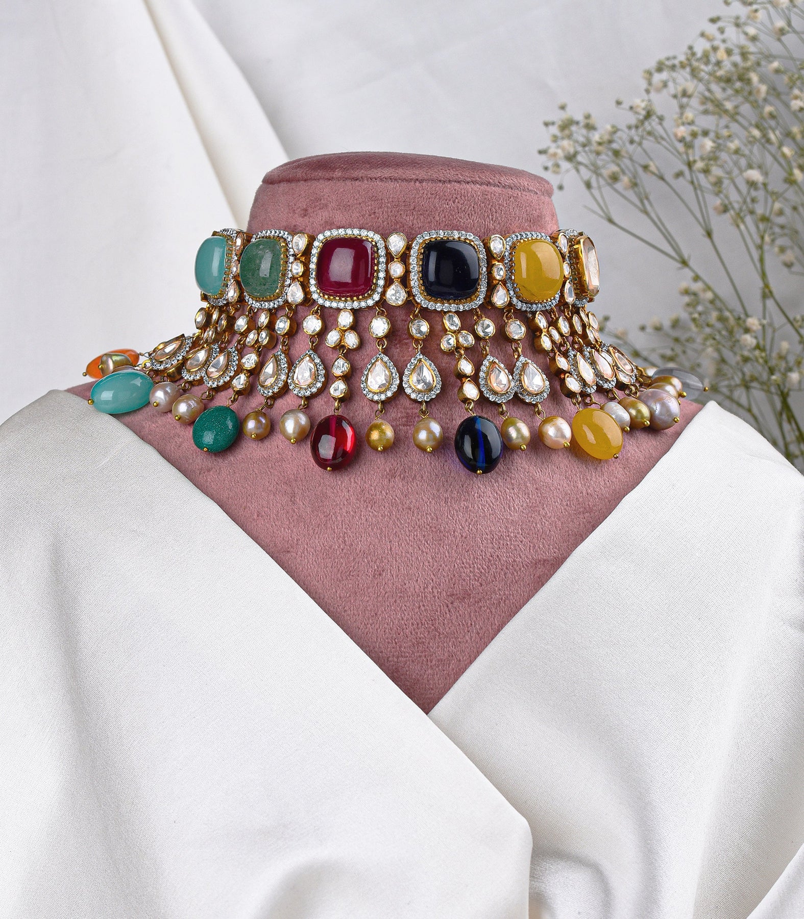 Exquisite Navratan & Moissanite Necklace Set: Crafted in sterling silver, adorned with vibrant Navratan stones and dazzling Moissanite, elegantly plated with a gold finish. Featuring contemporary design accents and delicate Navratan pearl drops for timeless sophistication.