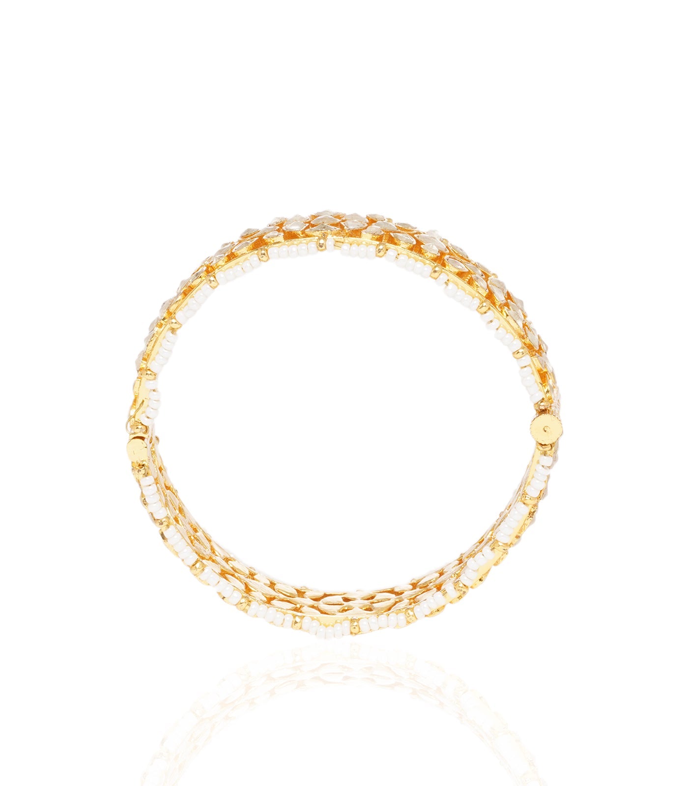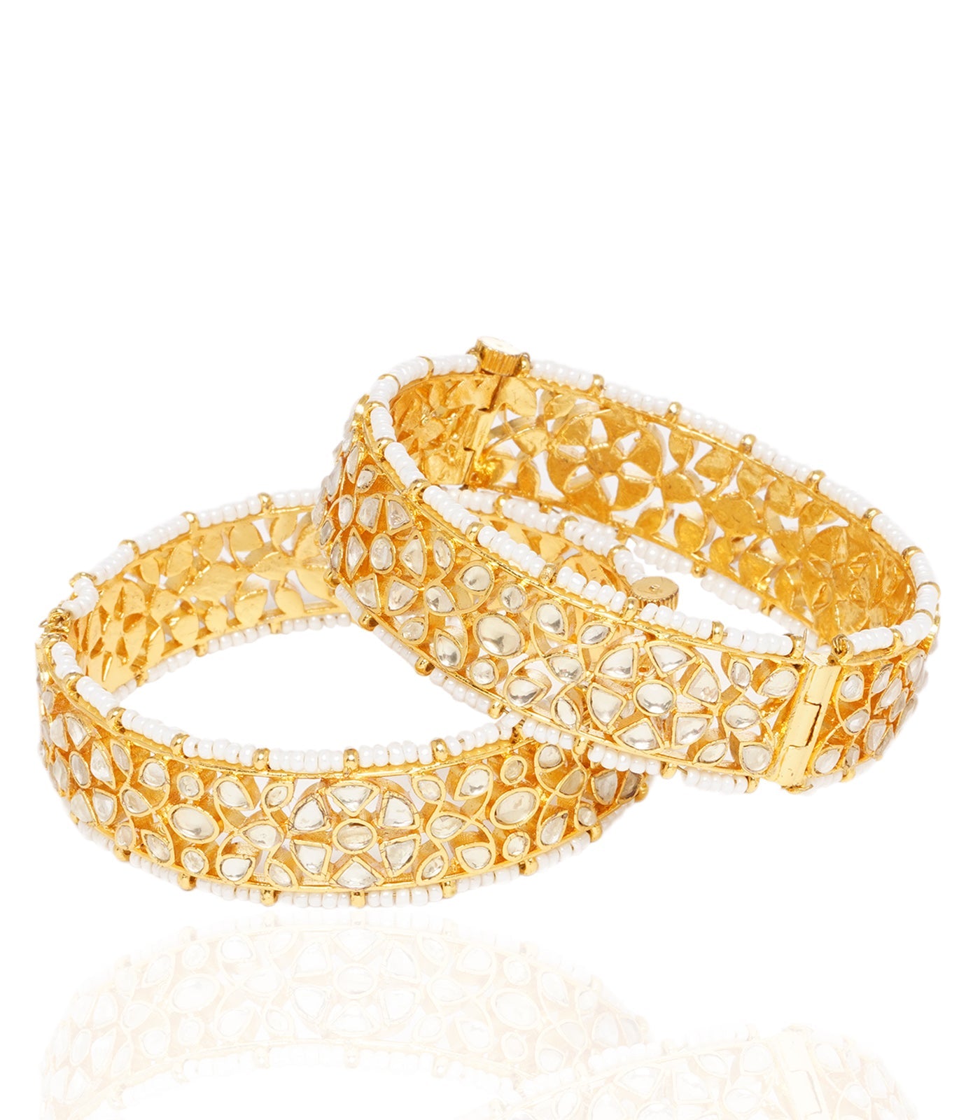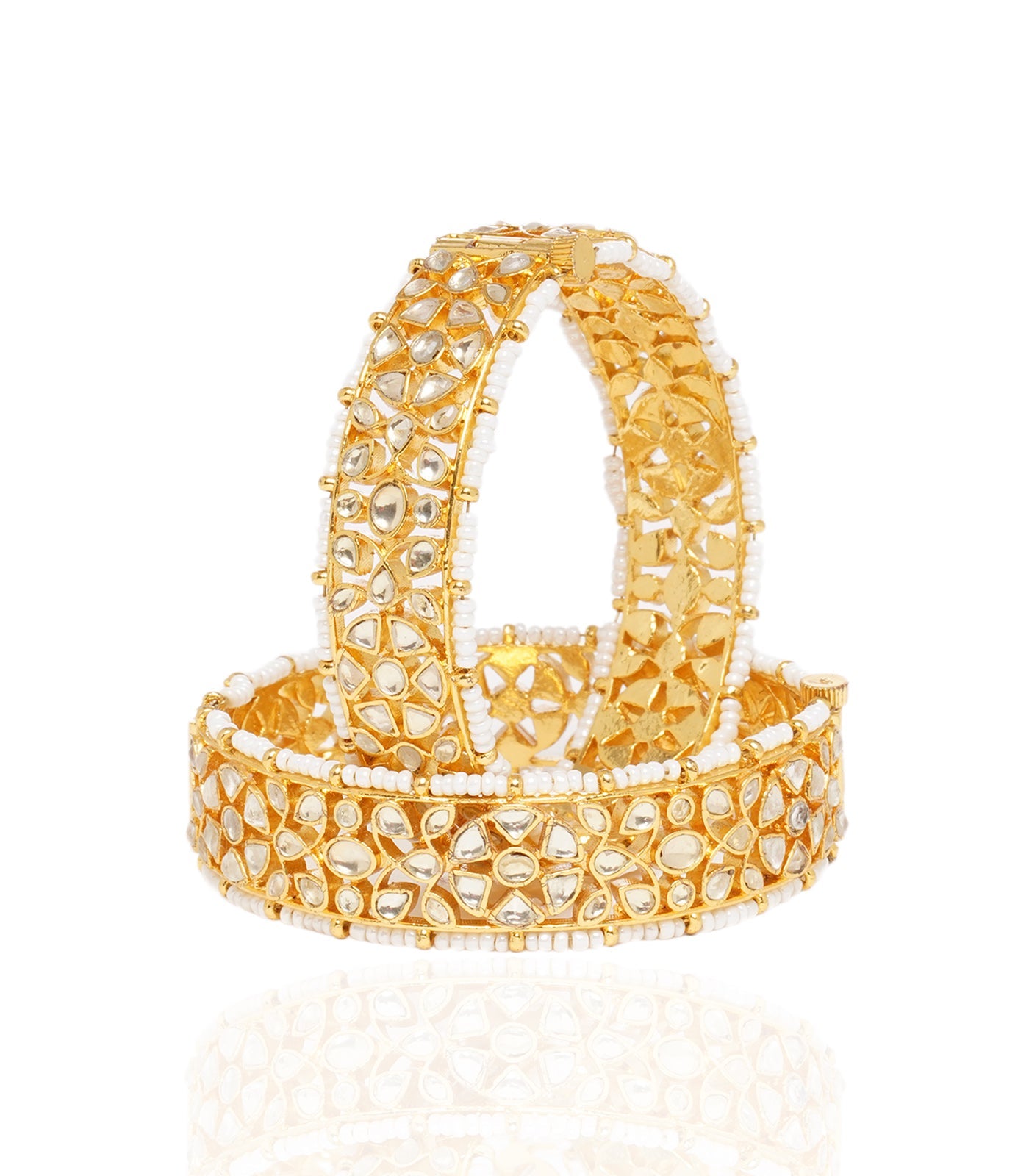 Incandesce with grace in our Gold-Plated Kundan Bangles, delicately outlined by tiny pearl strings. Adorned with radiant Kundan pieces, this pair effortlessly captures attention, offering a brilliant and shiny touch to your ensemble.