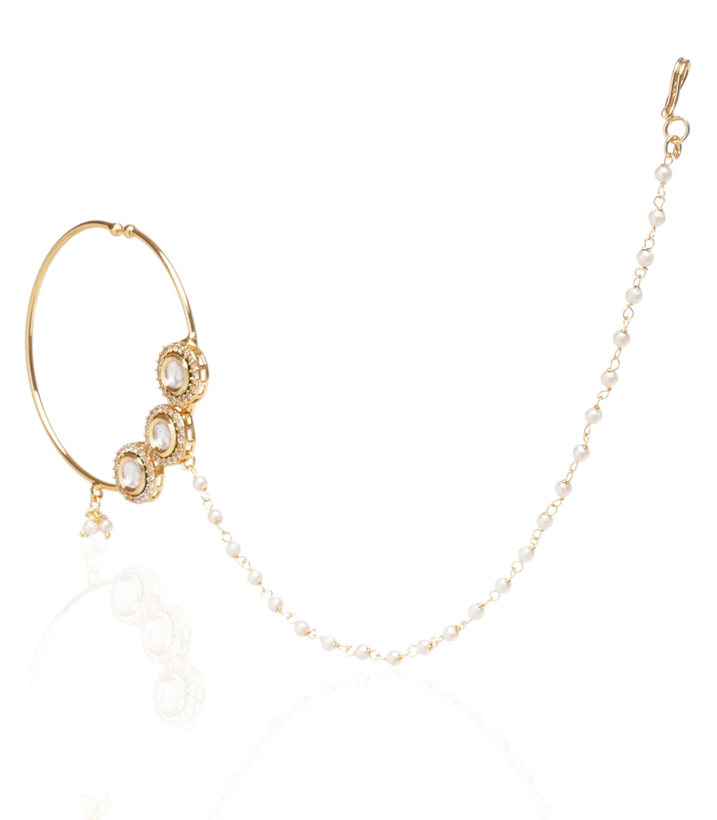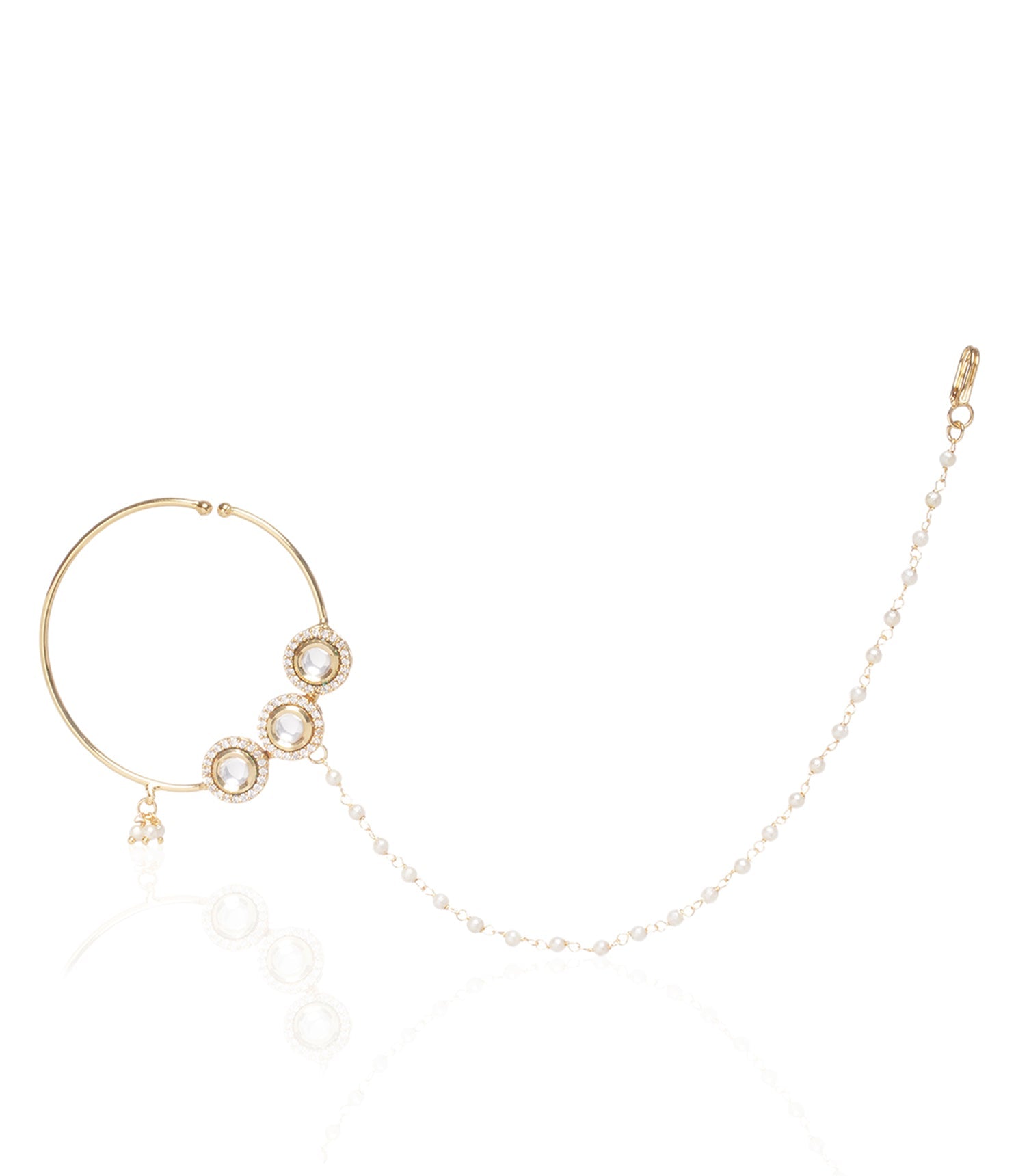 Uplift your charisma with our Gold-Plated Kundan Nose Ring, a minimalistic beauty inspired by three circles. This dainty piece adds a touch of understated elegance to your look, perfect for those who appreciate simplicity with a hint of sophistication.