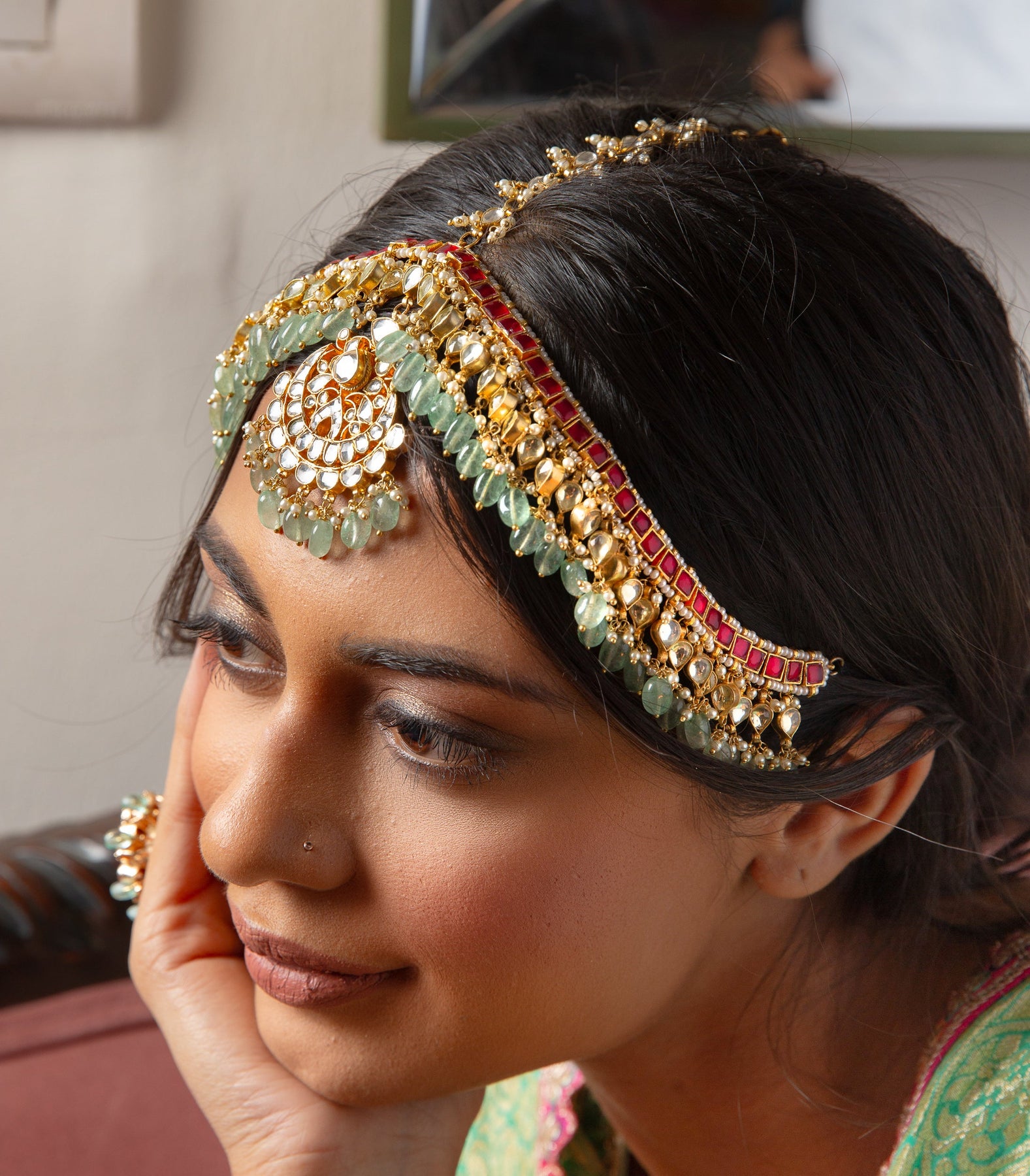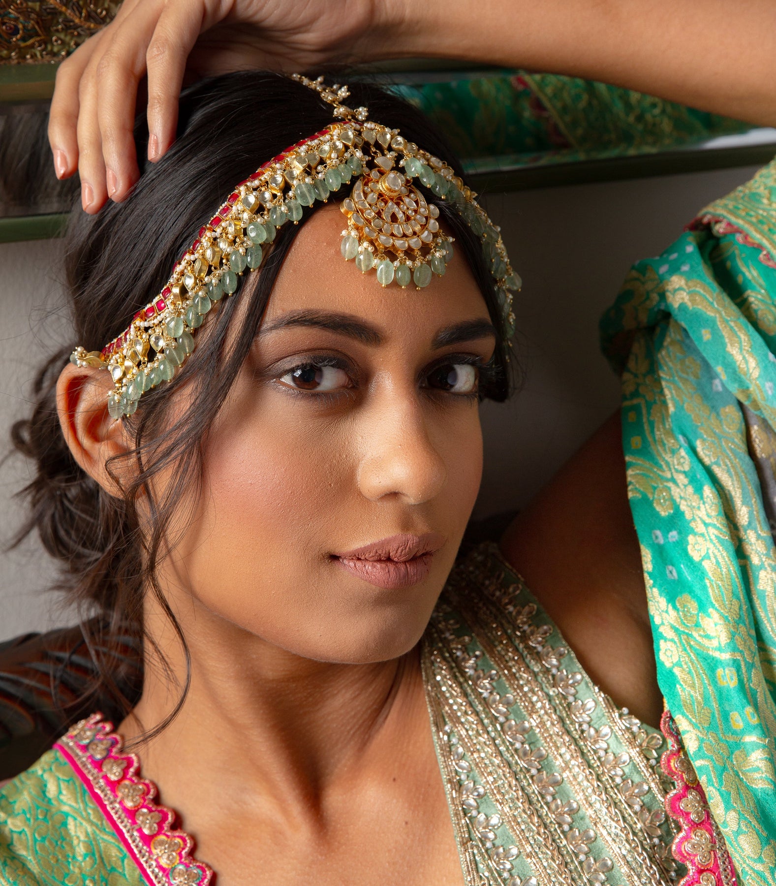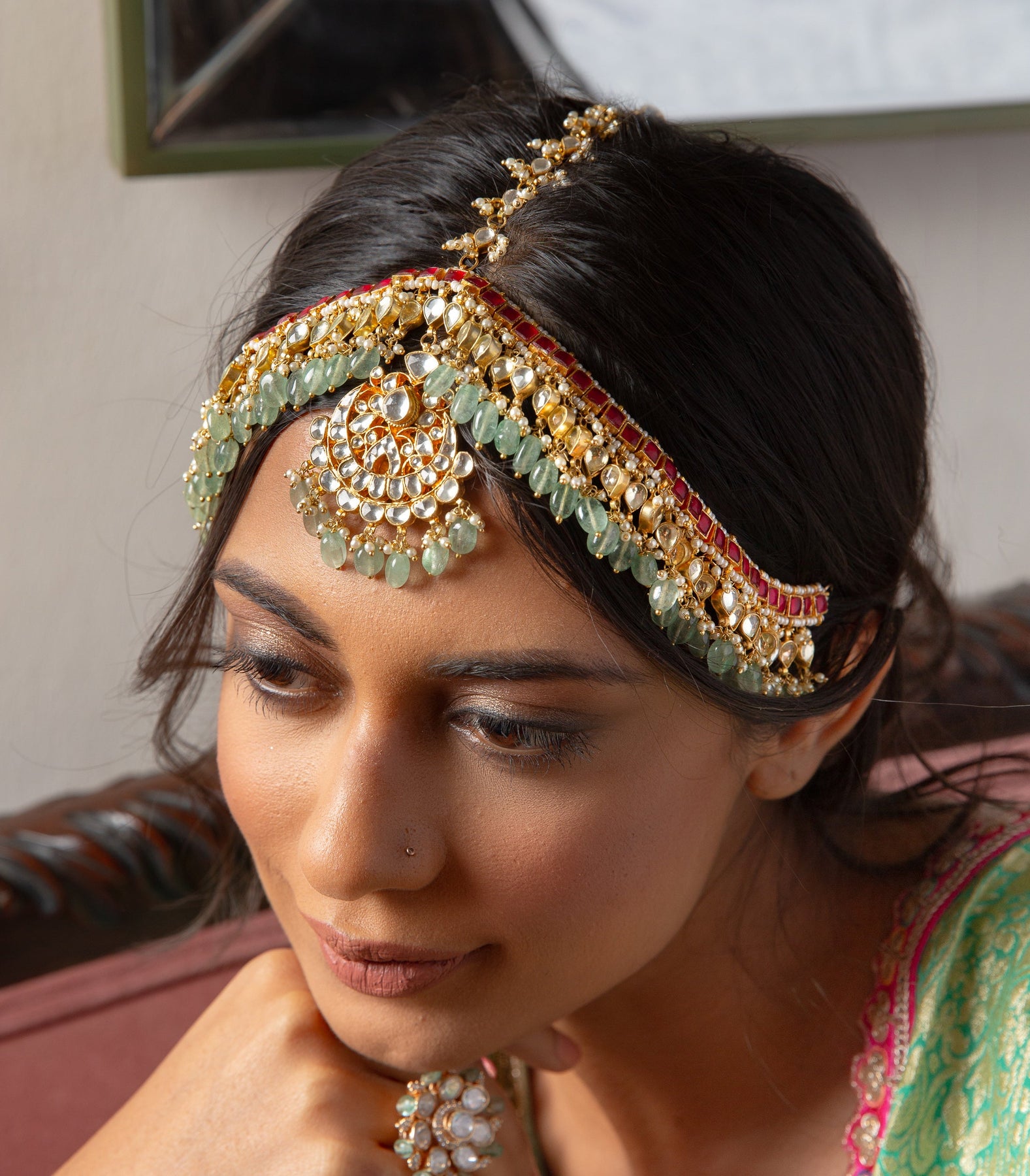 Modern elegance meets tradition in our Kundan Mathapatti. The gold finish and green fluorite drops create a contemporary allure, making a statement that blends sophistication with a touch of tradition.