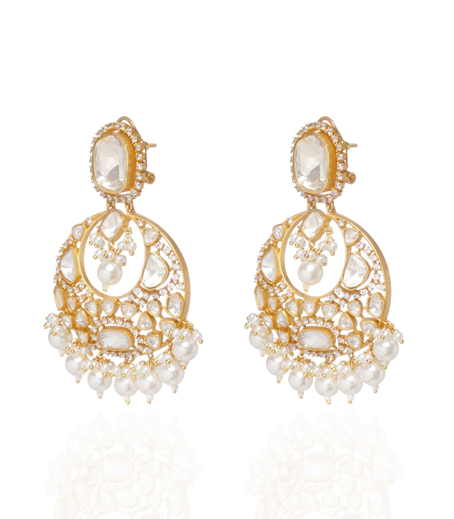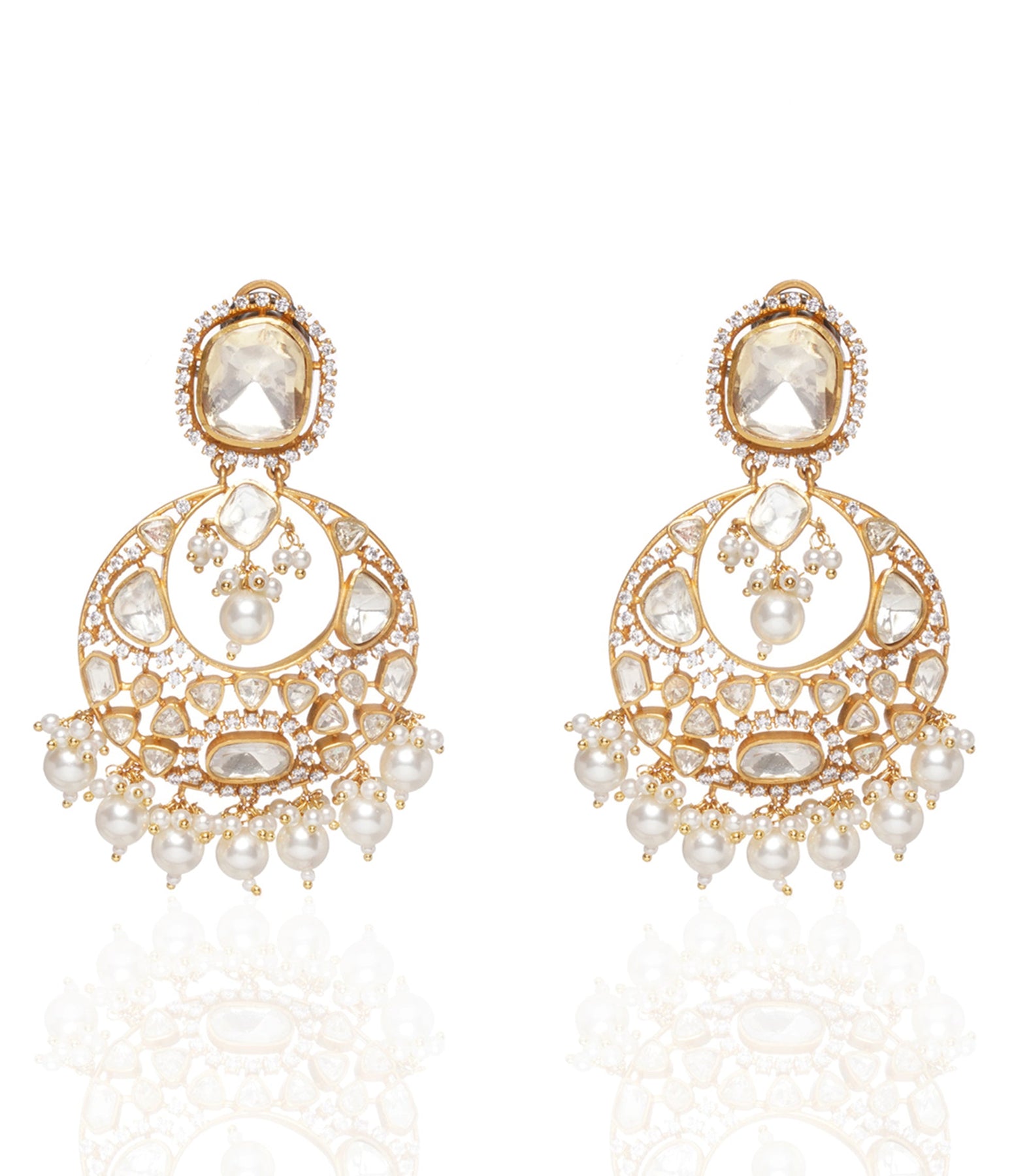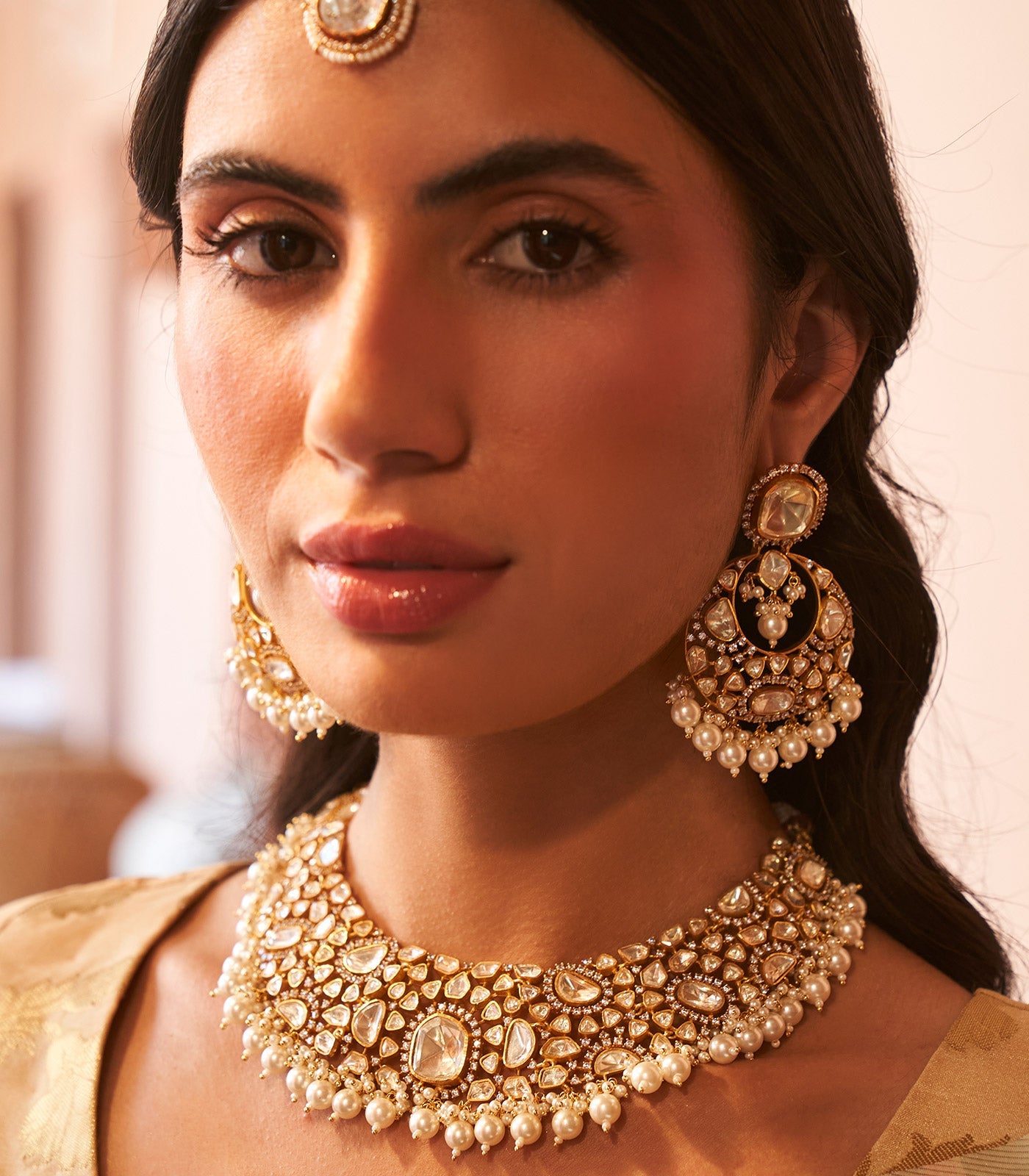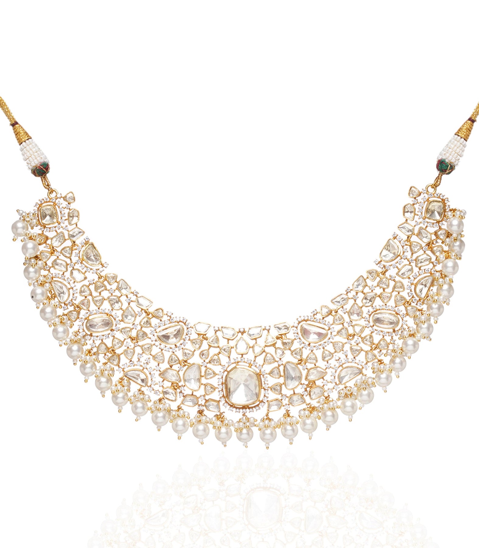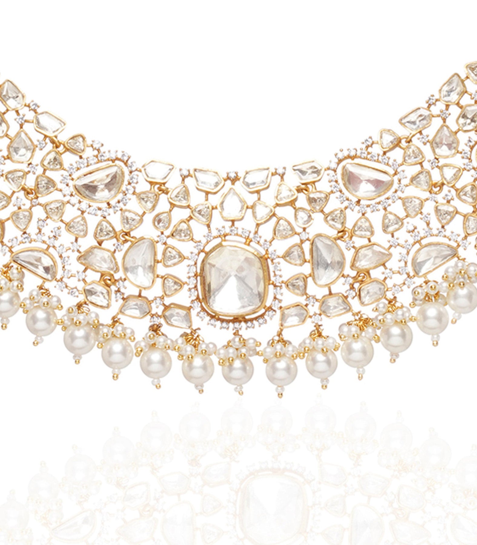 Dazzle in sophistication with our luxurious necklace set. Clear moissanite stones on sterling silver, delicately plated with gold, culminate in a stunning ensemble that includes a necklace and Chandbalis. Elegant pearl drops add a touch of timeless allure, making this set a radiant statement of refined glamour.