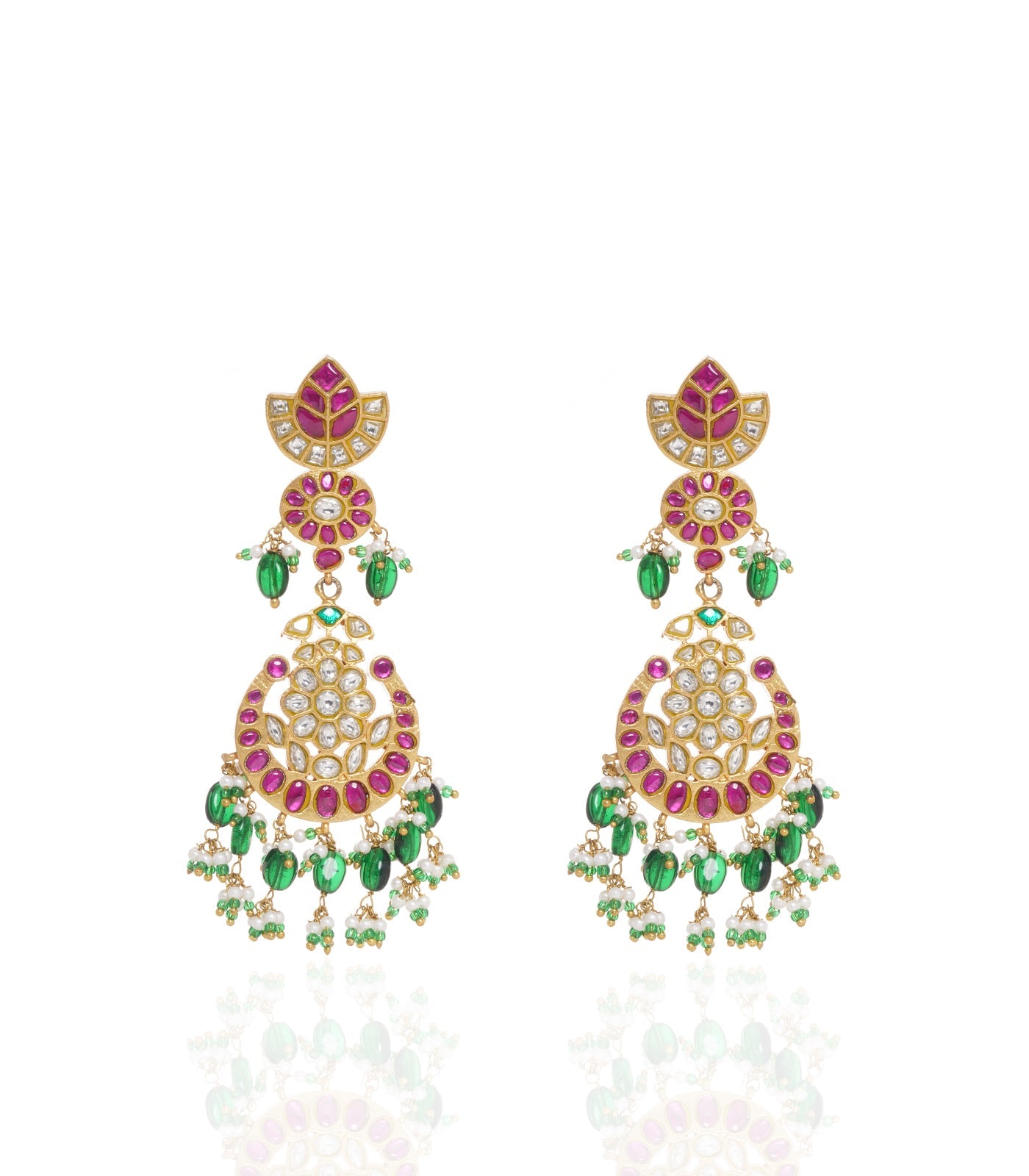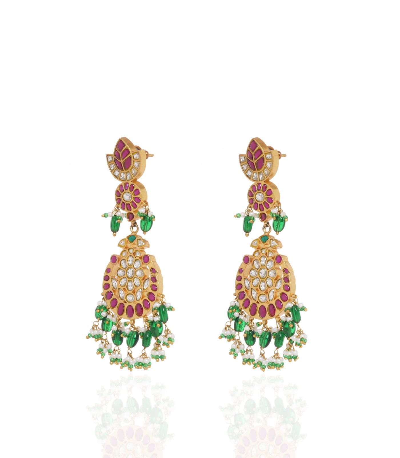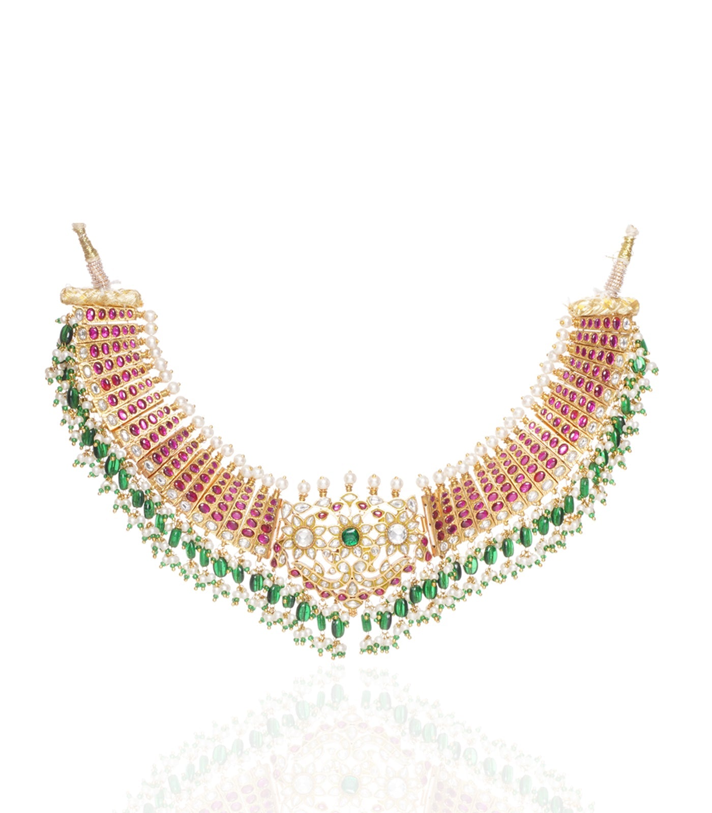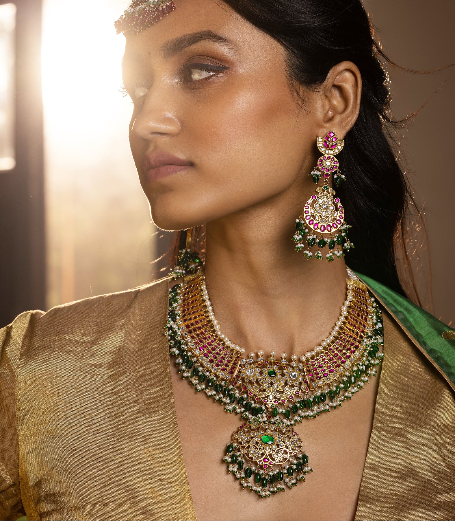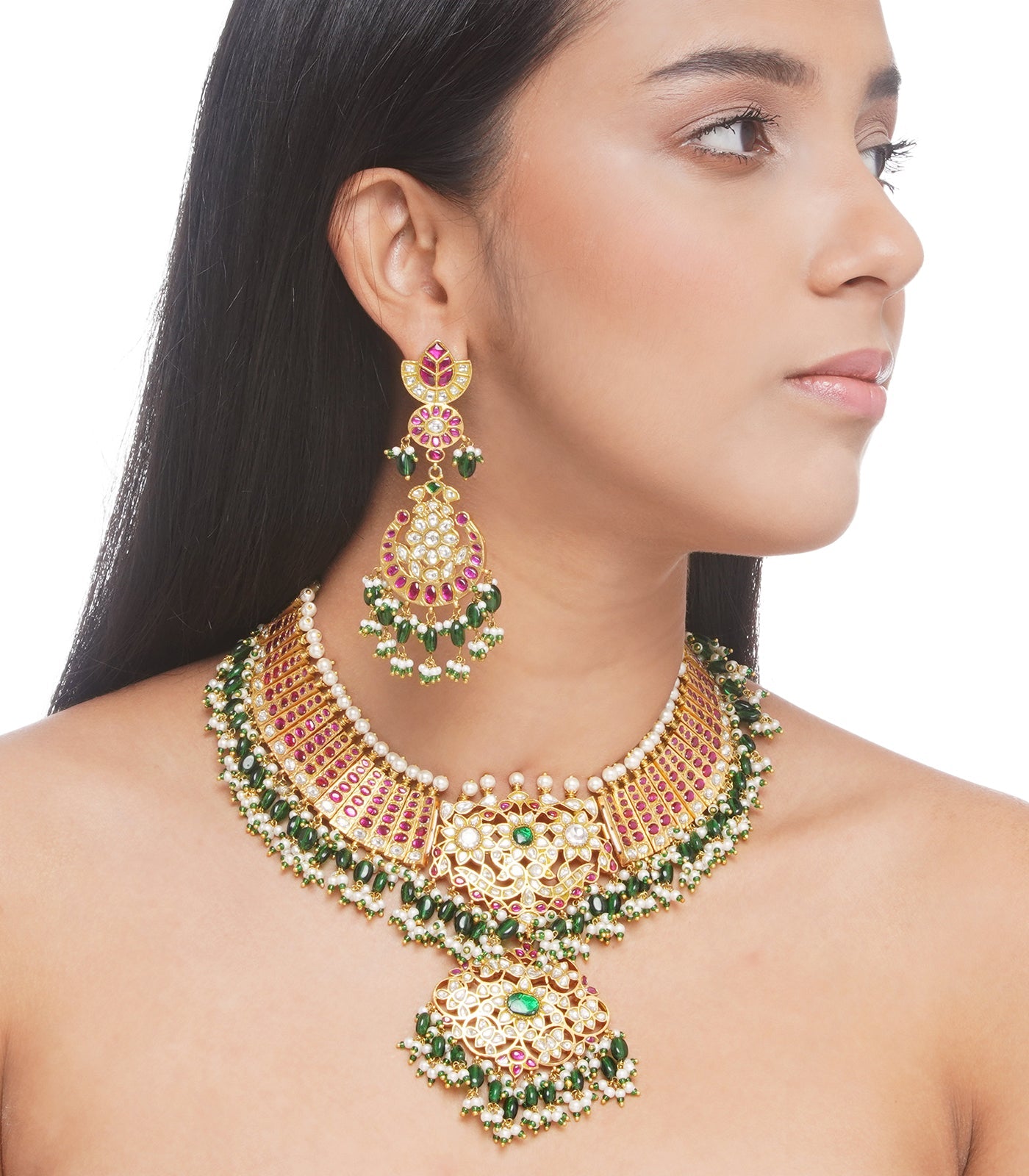 Flow with your tradition with our Ruby Kundan Necklace Set. The gold finish, adorned with ruby and kundan stones, green onyx, and pearl drops, exudes a timeless elegance. Delicately outlined by pearls, this set adds a touch of sophistication to your traditional ensemble.
