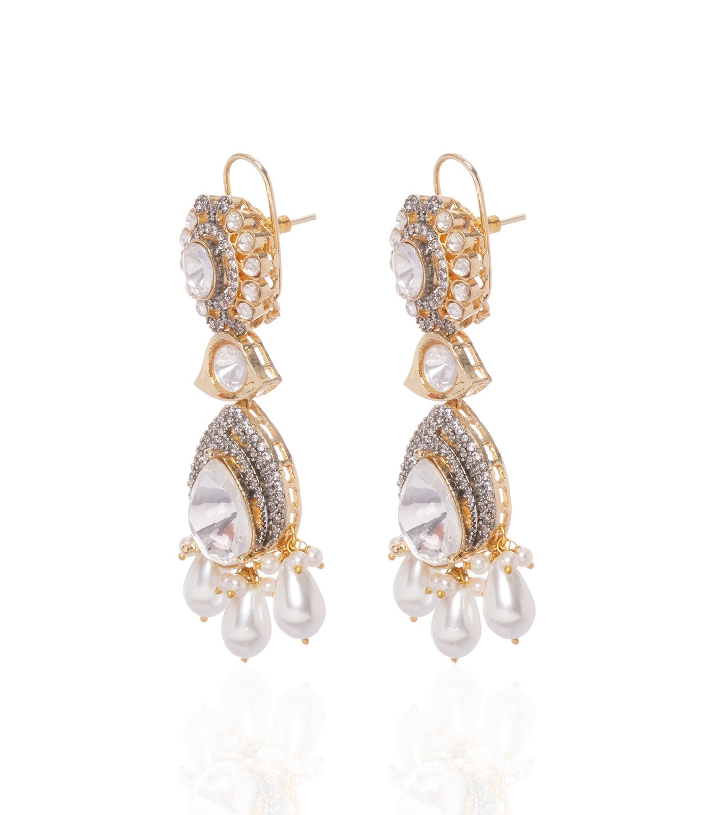 This exquisite Polki necklace set exudes royal elegance, featuring a stunning choker-style necklace adorned with intricate Polki craftsmanship and pearl drops for a touch of timeless charm. The set includes a matching pair of earrings and a delicate maang tikka, all designed to enhance your regal aura. Perfect for weddings and grand occasions, this set seamlessly combines traditional artistry with a statement-worthy appeal.