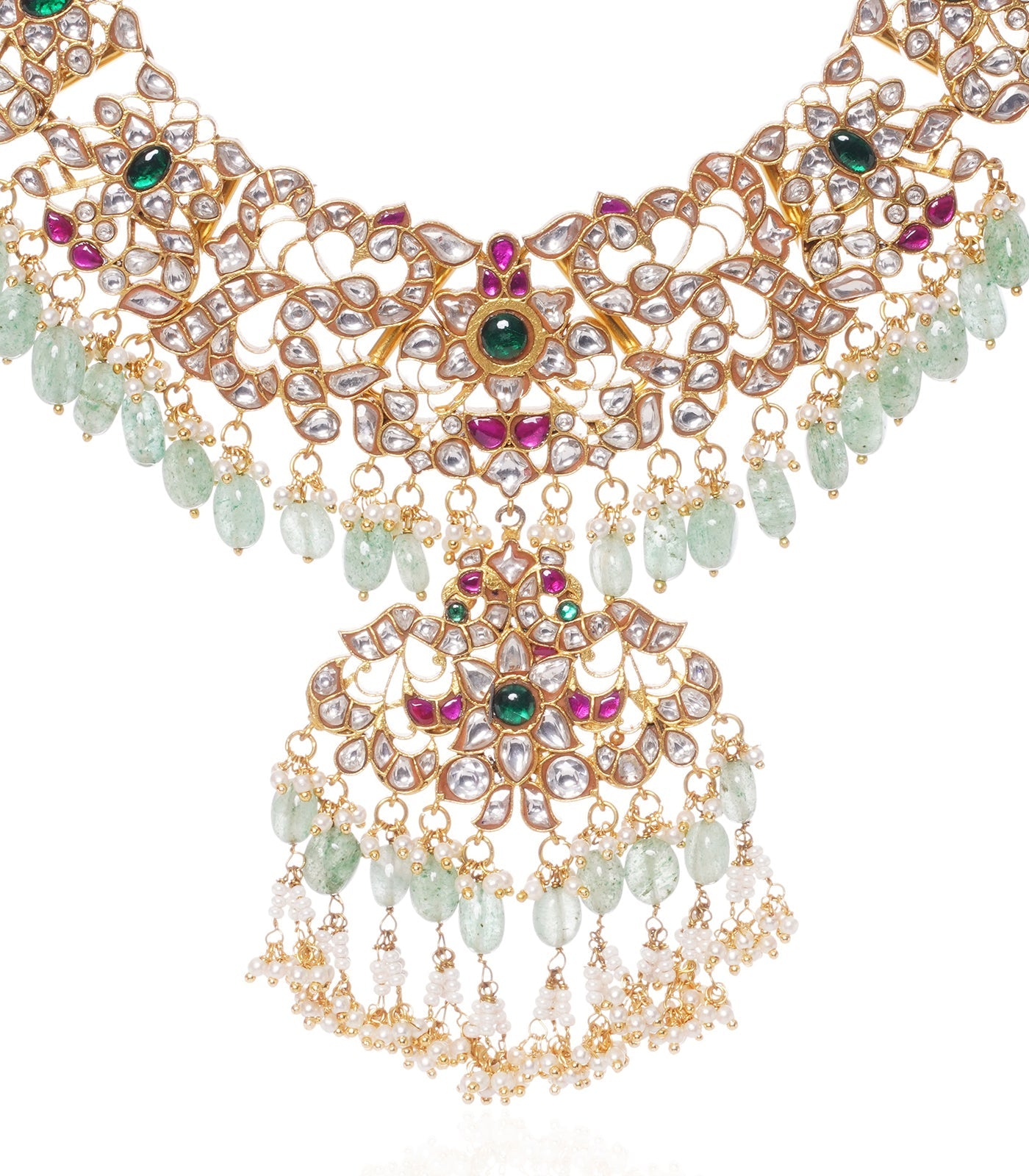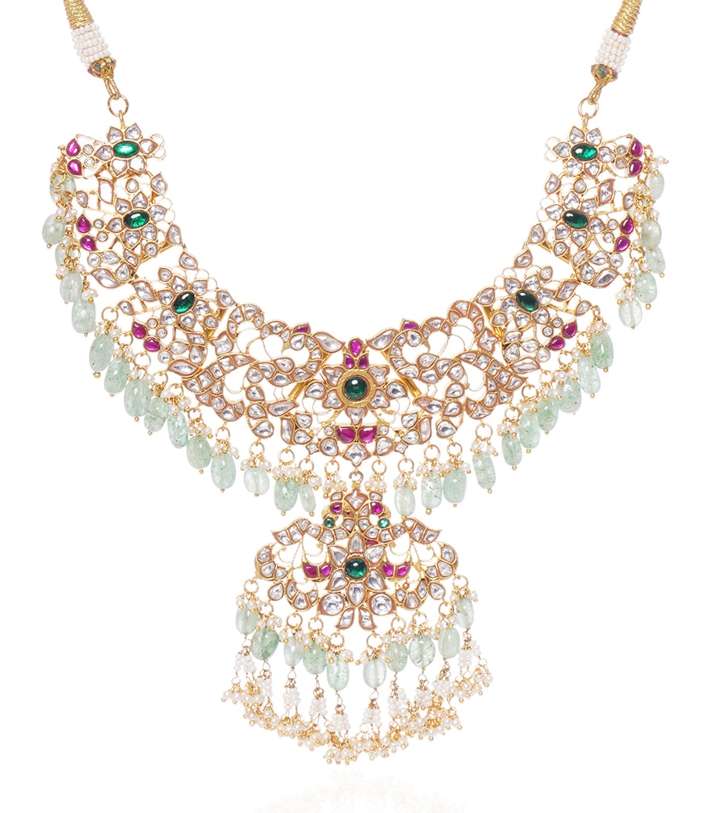 This astonishing Kundan necklace set exudes a regal charm with its unique and intricate design. Featuring a statement choker embellished with exquisite Kundan stones, the set is enhanced with elegant pearl and green onyx drops, adding depth and sophistication. The matching earrings complete the ensemble, making it a perfect choice for those seeking to make a bold, royal statement at weddings or grand celebrations. A true masterpiece that blends tradition with opulence.