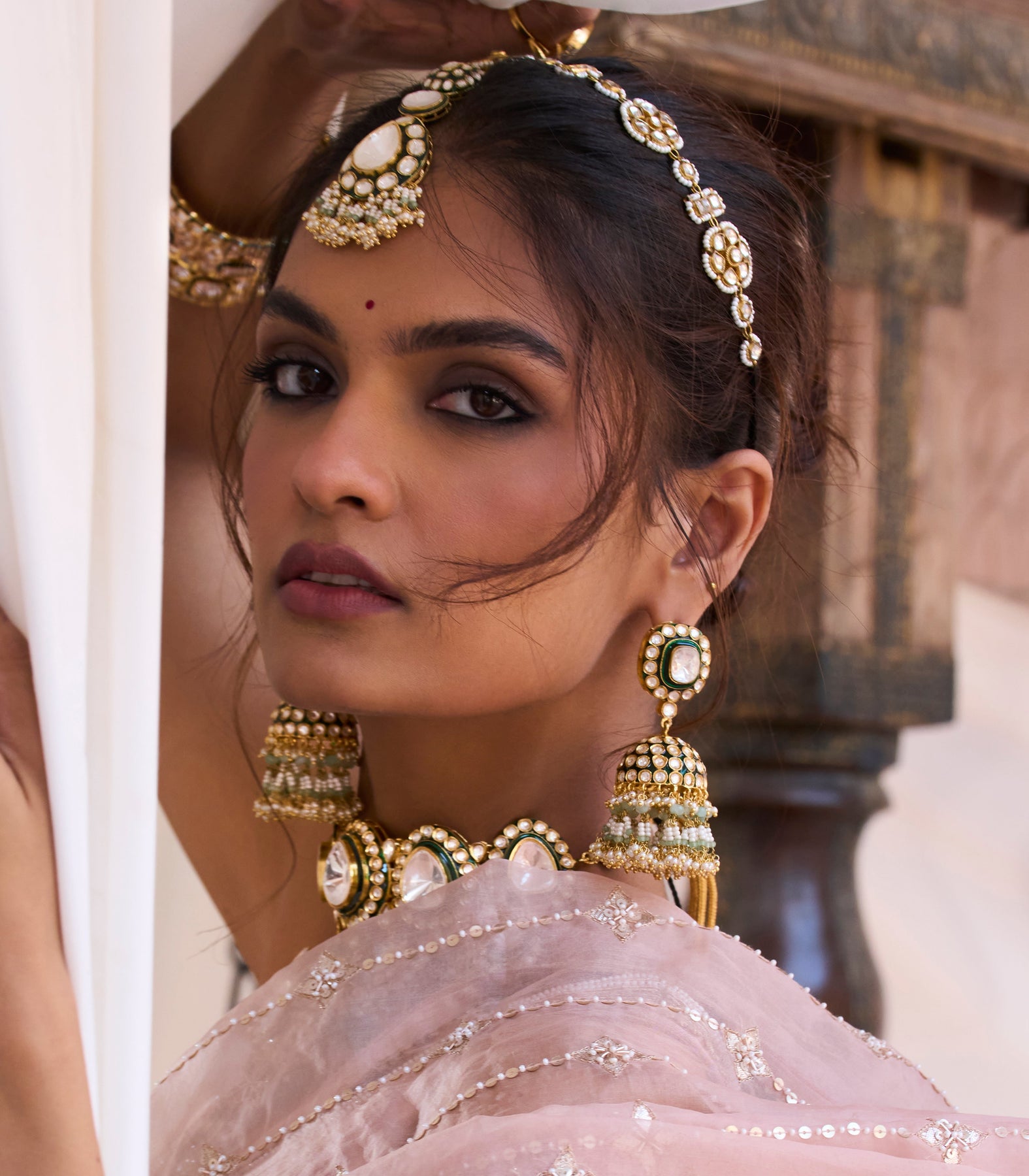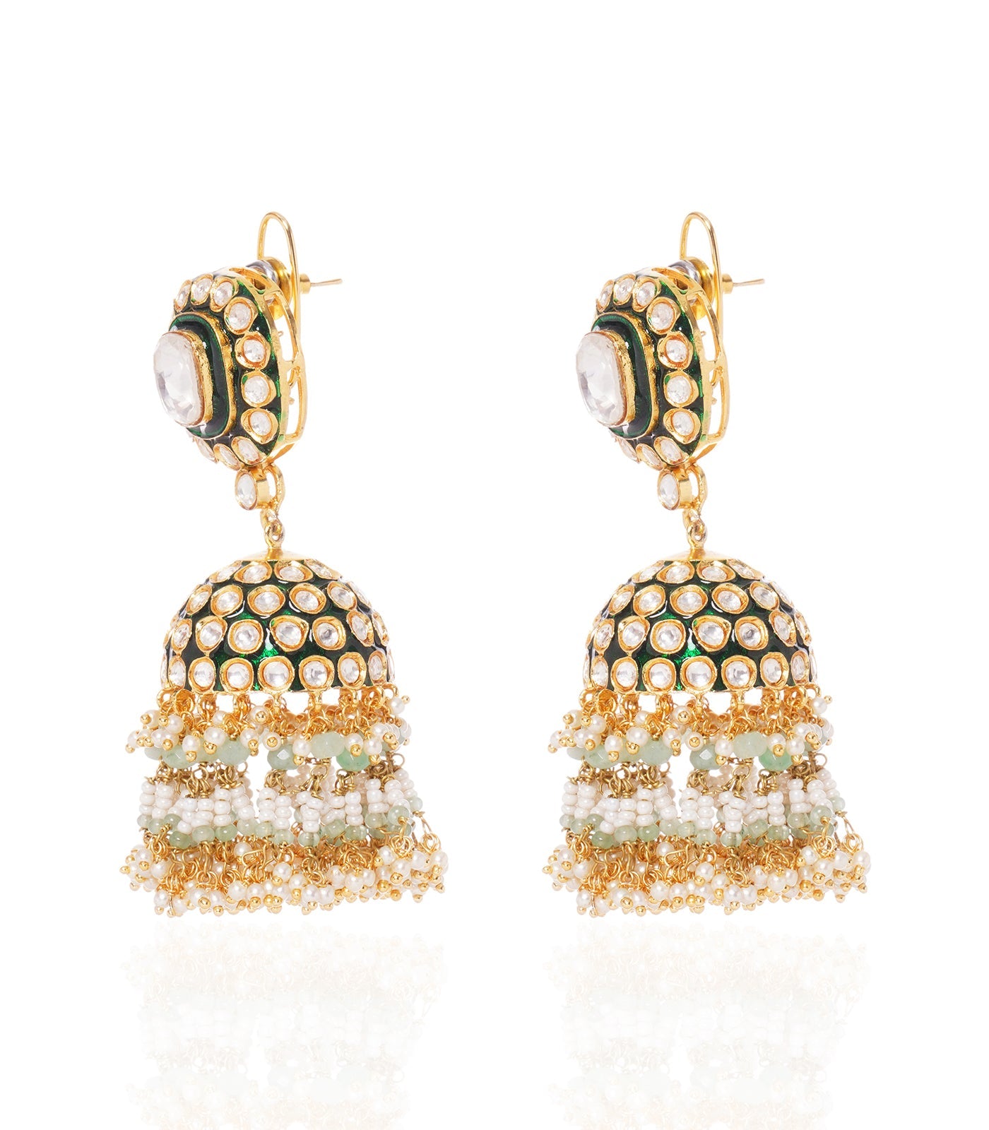 Dress in royal elegance with our Kundan Jhumkas. Plated in gold finish on alloy base, meticulously crafted with regal flair, adorned with pearls and green onyx drops, and finished with exquisite meenakari work, this set embodies timeless sophistication.